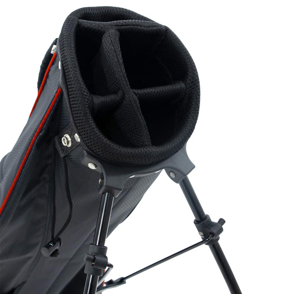 Crafted from robust yet lightweight material, the LTE range is equipped with an automatic integral flip stand featuring rubber non-slip tips, ensuring stability wherever you place your bag. The 5-way graphite-friendly top allows for easy organisation of your clubs, while added padding around the lumbar area enhances comfort during transport. Furthermore, the fully adjustable dual shoulder strap ensures a personalised fit.