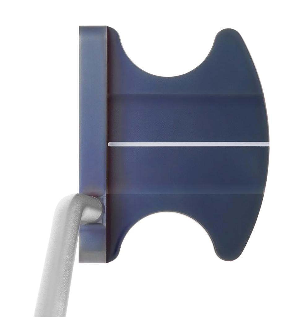 The smooth topline seamlessly transitions into the body of the putter, delivering a clean aesthetic and enhanced alignment capabilities that extend across the entire flange during setup. Additionally, semi-circle cutouts located at the top and bottom further define the elongated alignment feature, simplifying the setup process for the user.