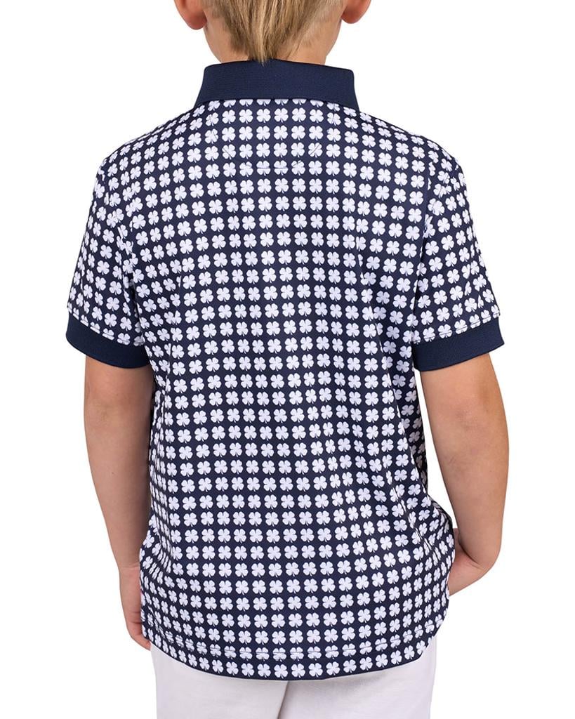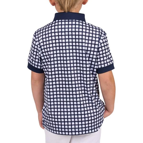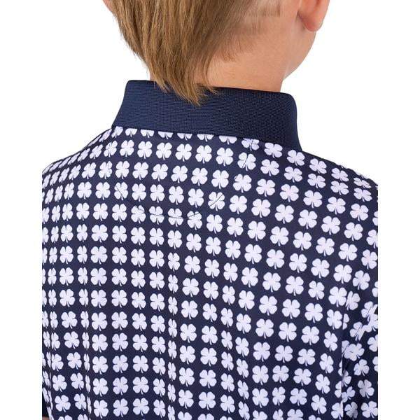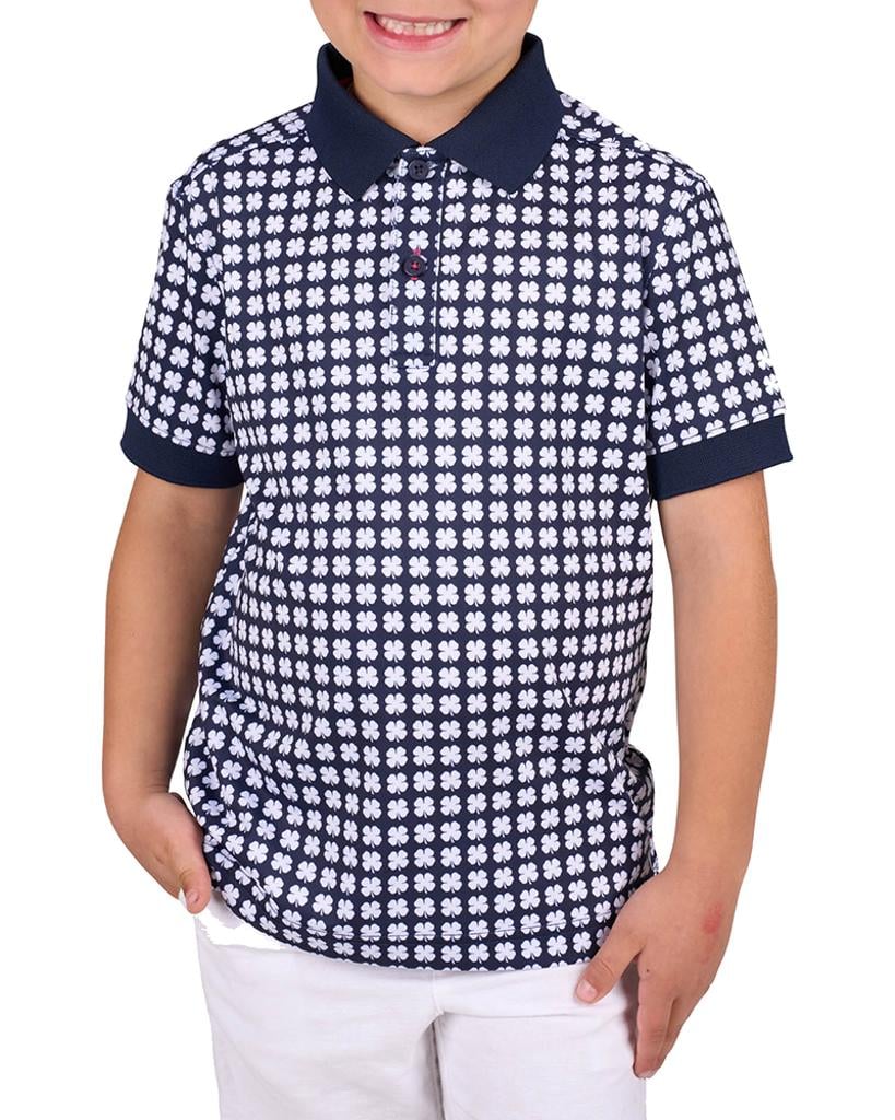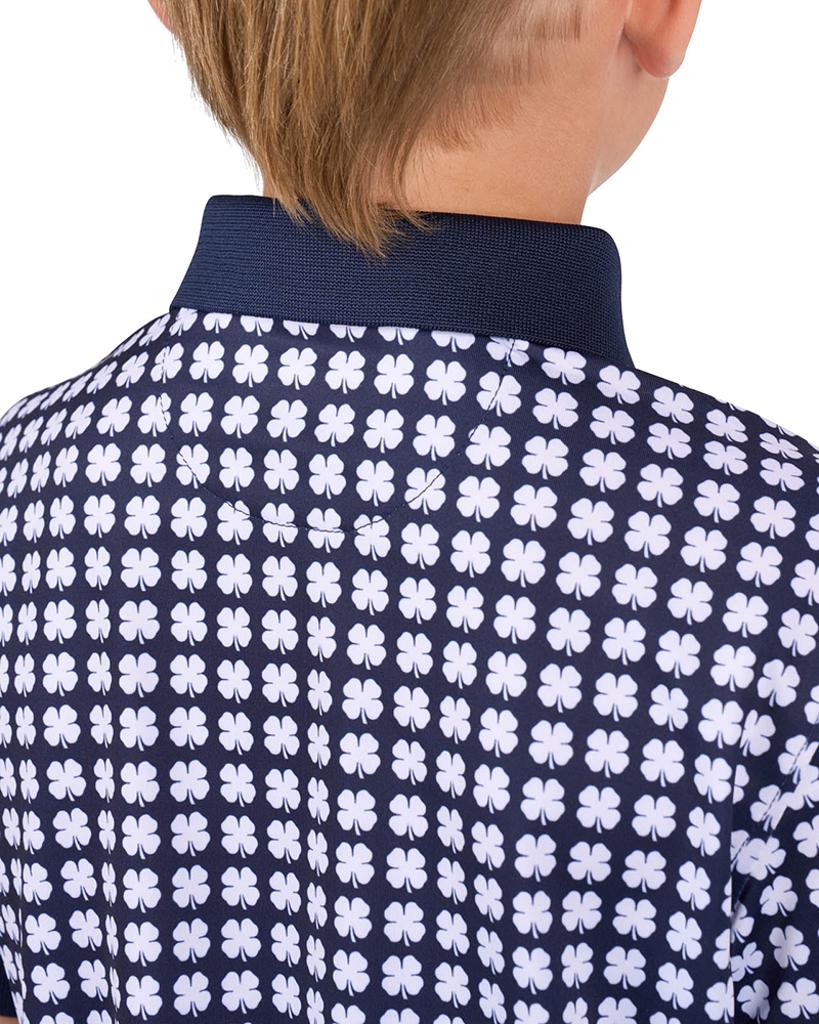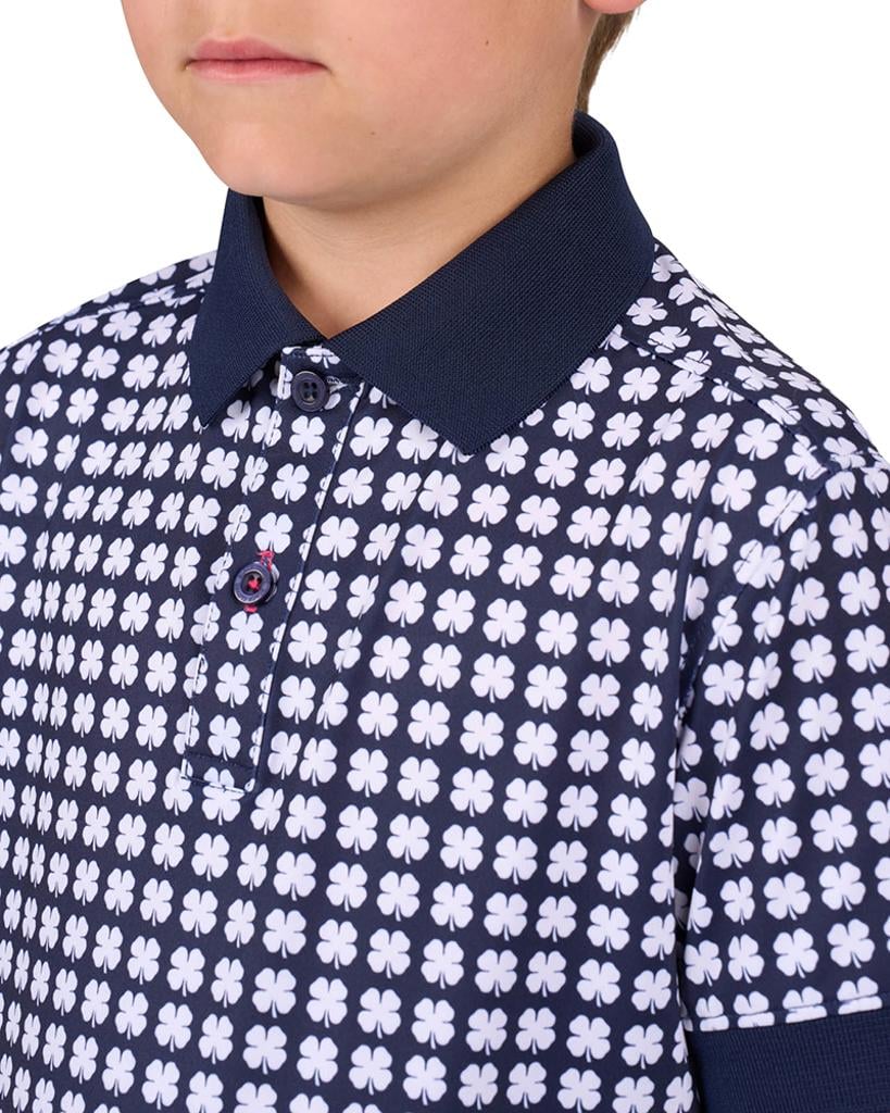 This attractive navy polo features a delightful white clover pattern, enhanced by matching navy collars and cuffs. Crafted with no-curl rib knit trim, it guarantees breathability, easy maintenance, and a remarkable 3-way stretch—ideal for both energetic play and relaxed outings.