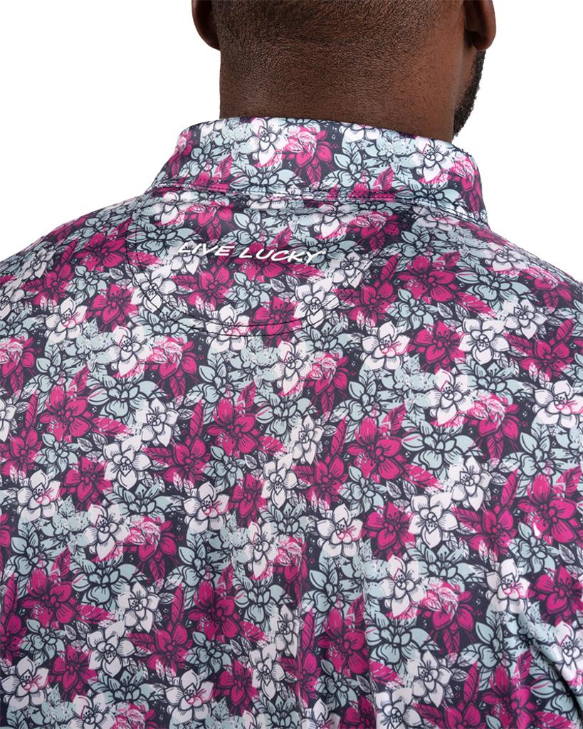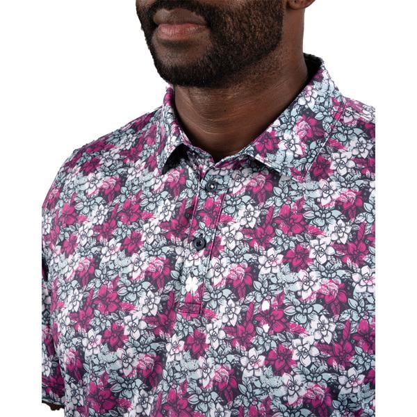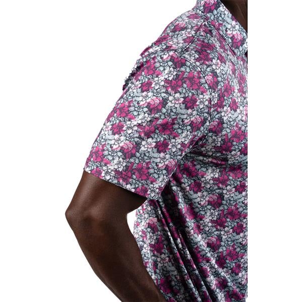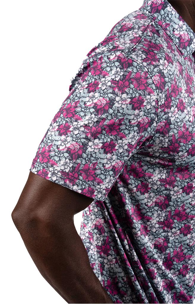 Crafted from a high-quality poly-spandex blend, this polo shirt guarantees a breathable, wrinkle-resistant design to maintain a polished appearance throughout the day. Adorned with a striking all-over flower pattern, it merges fashionable style with comfort and boasts low shrinkage for enduring wear.