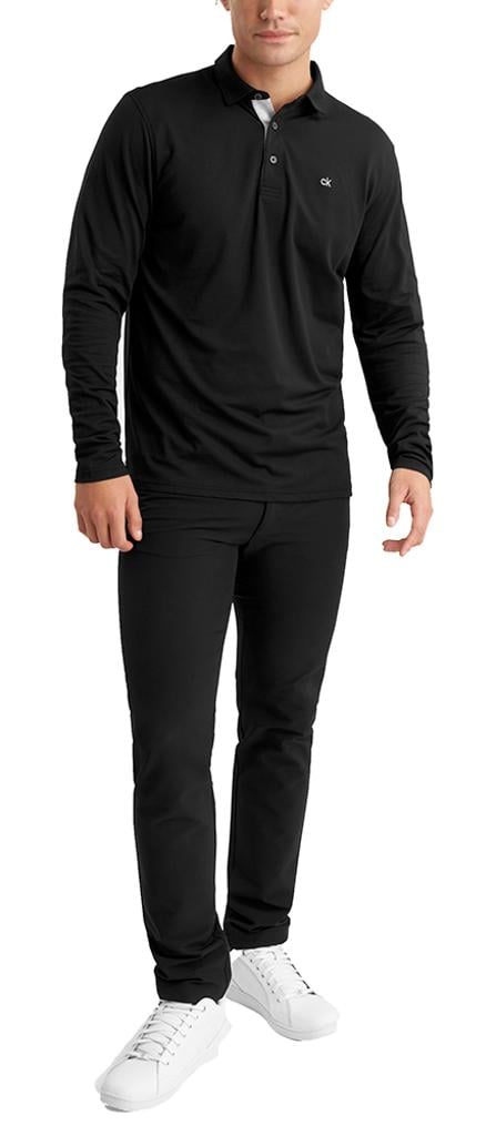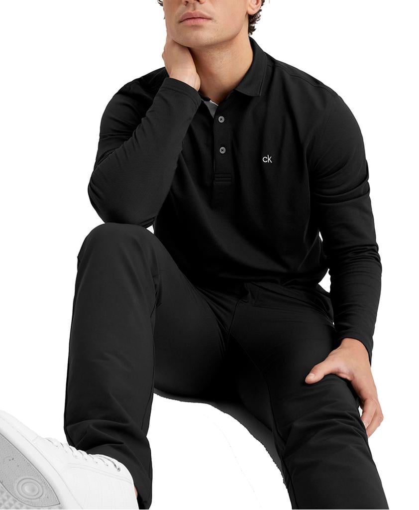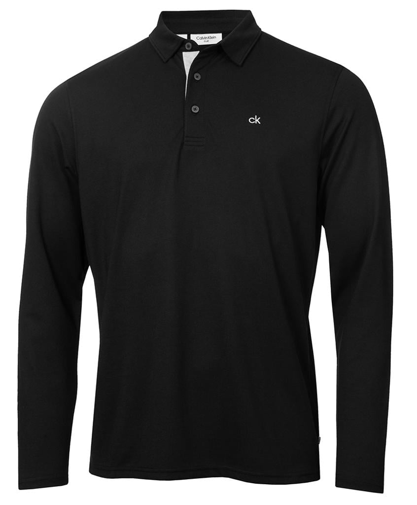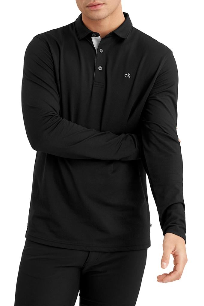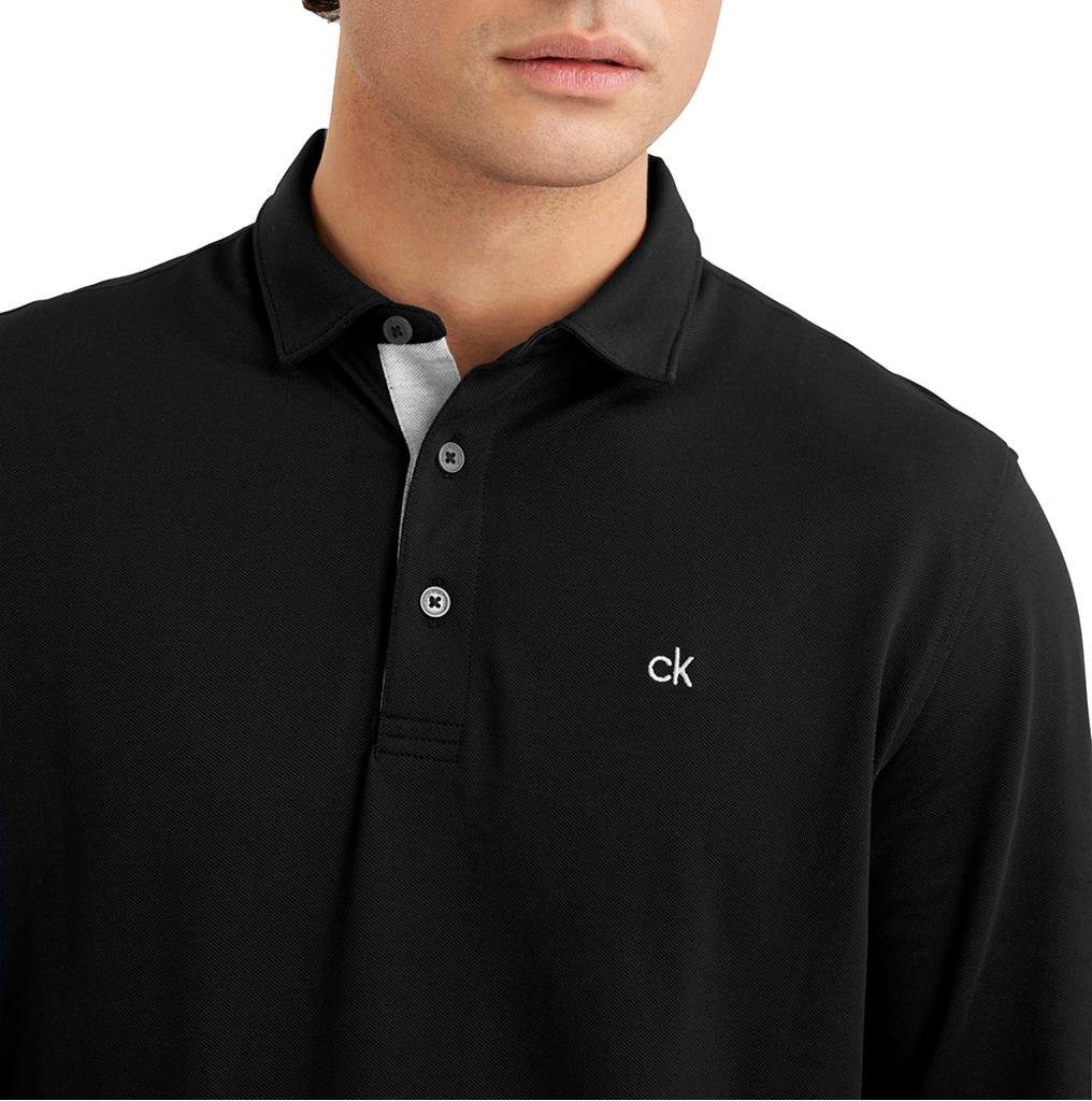 Introducing the Calvin Klein Performance Long Sleeve Polo, meticulously designed with a sleek self-fabric collar and open hemmed cuffs.