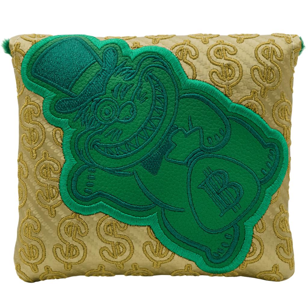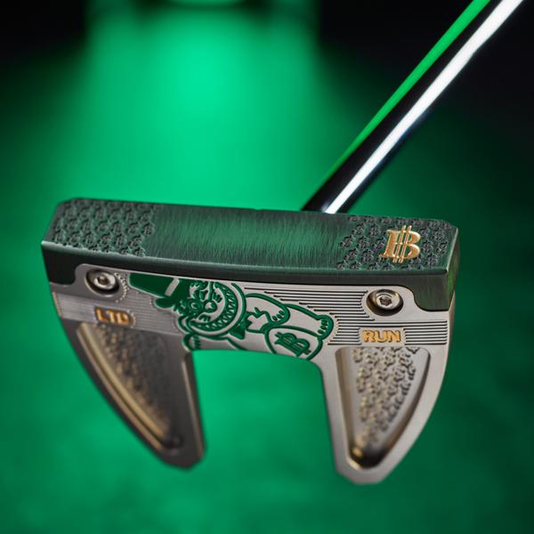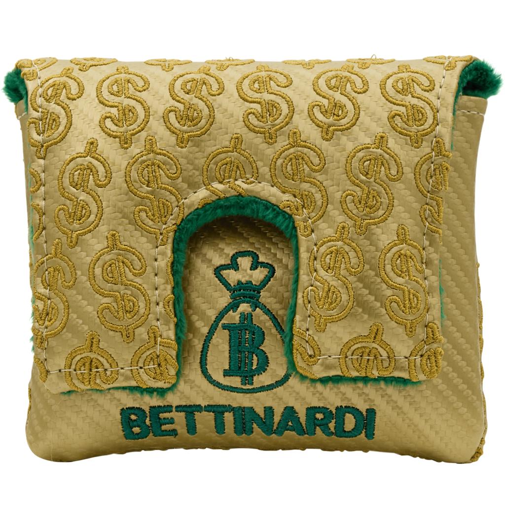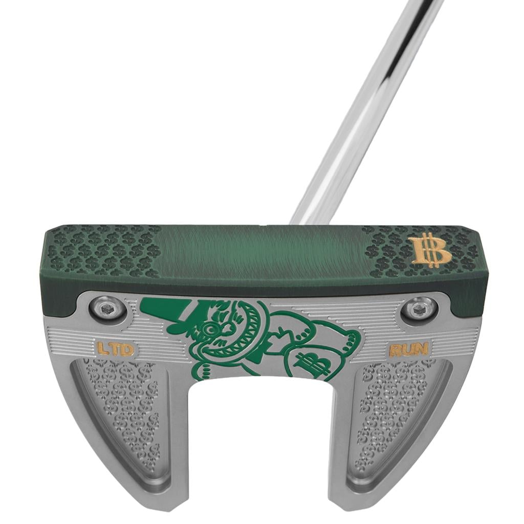 The Tour Blast 303 SS body showcases a Wall Street Lucky Cat along with dollar signs elegantly engraved onto the sole. Its design includes a single sightline complemented by a double flangeline alignment, all accentuated with green and gold paint fill throughout. This impressive putter is equipped with a chrome shaft, along with a green Bettinardi Hex B Gripmaster Perforated Leather Grip, and is completed by a Wall Street Lucky Cat Centre-Shafted Mallet Putter Headcover.