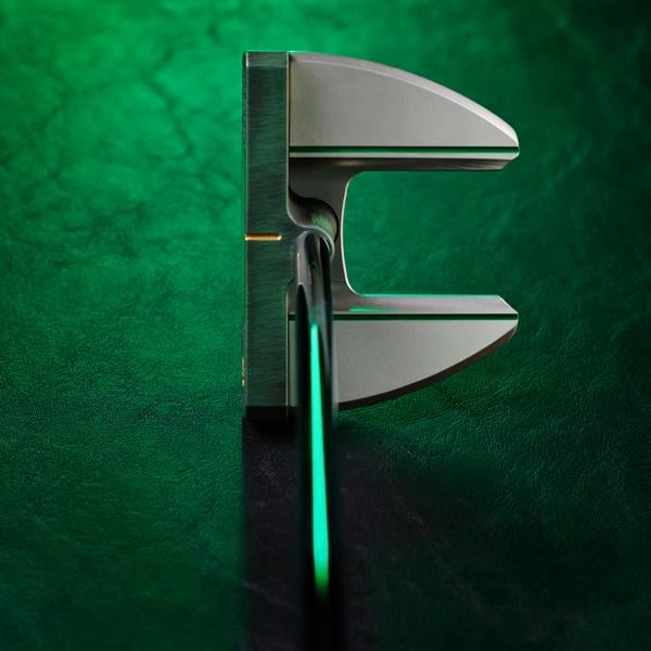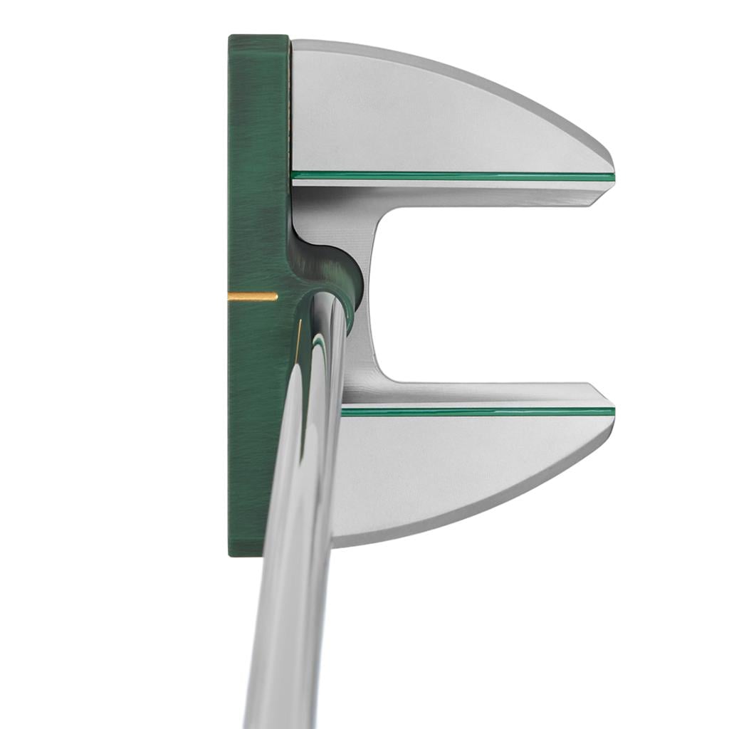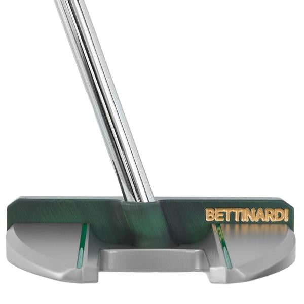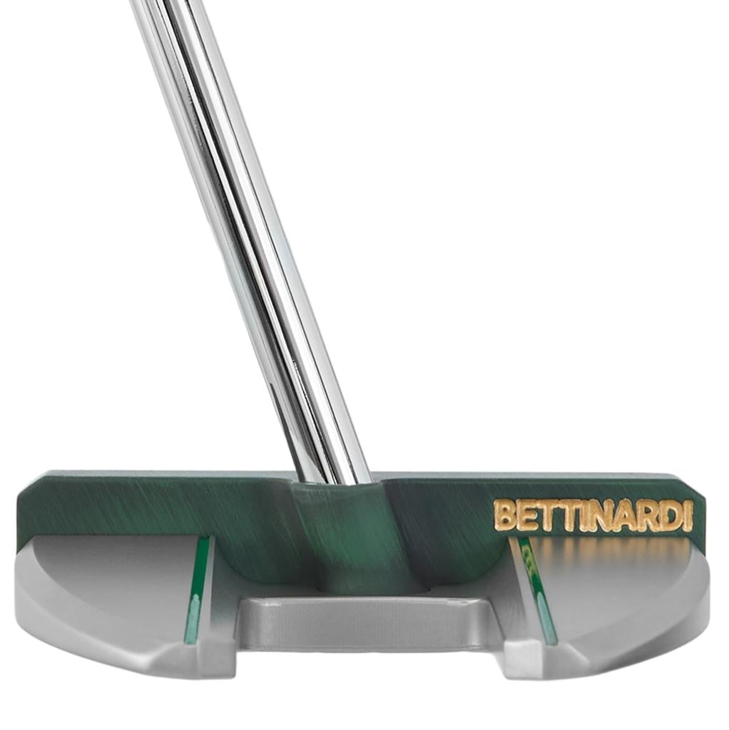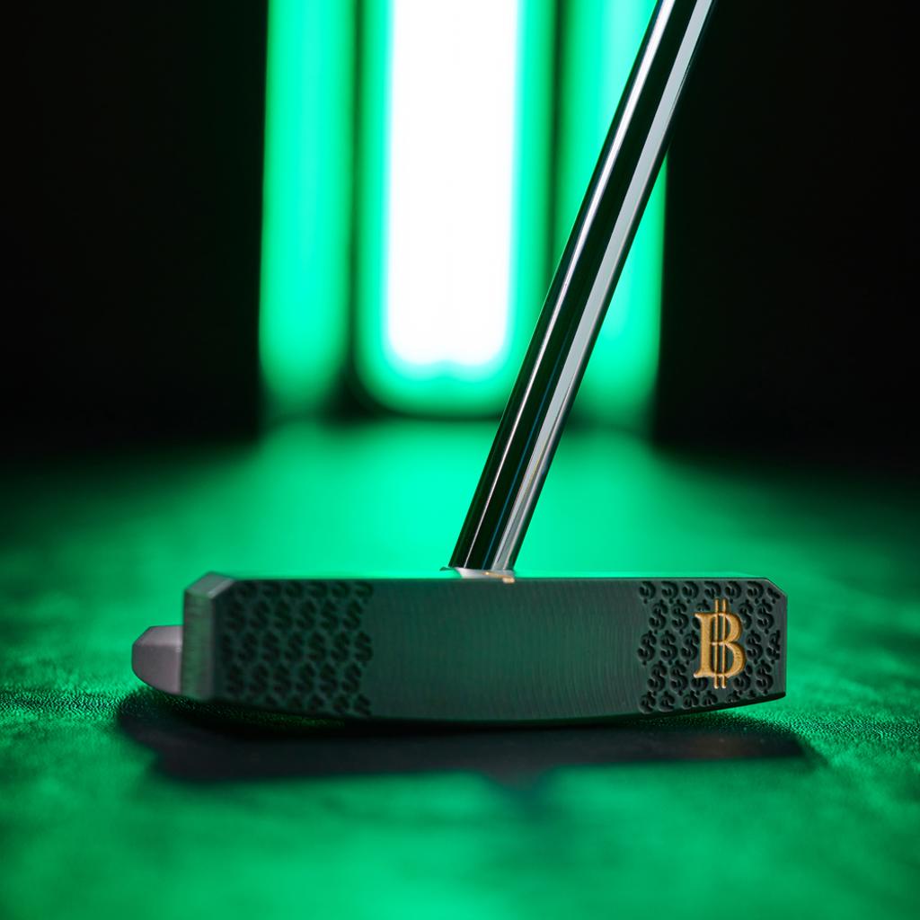 The Tour Blast 303 SS body showcases a Wall Street Lucky Cat along with dollar signs elegantly engraved onto the sole. Its design includes a single sightline complemented by a double flangeline alignment, all accentuated with green and gold paint fill throughout. This impressive putter is equipped with a chrome shaft, along with a green Bettinardi Hex B Gripmaster Perforated Leather Grip, and is completed by a Wall Street Lucky Cat Centre-Shafted Mallet Putter Headcover.