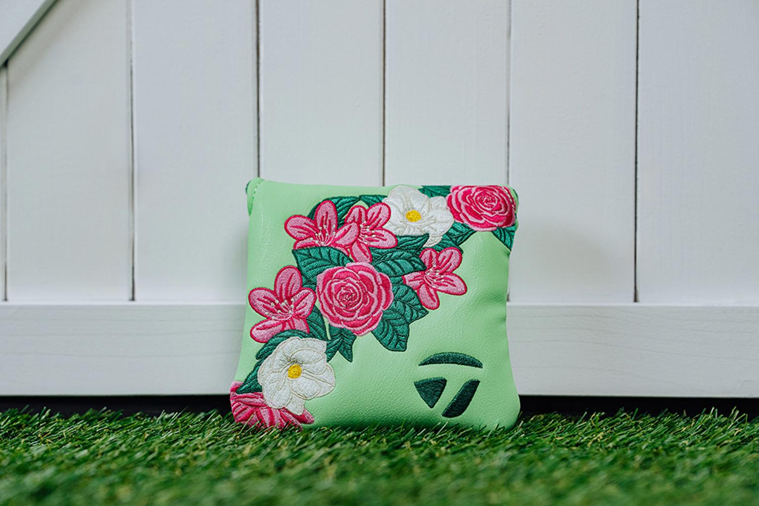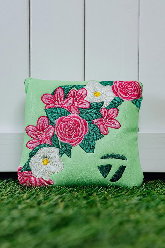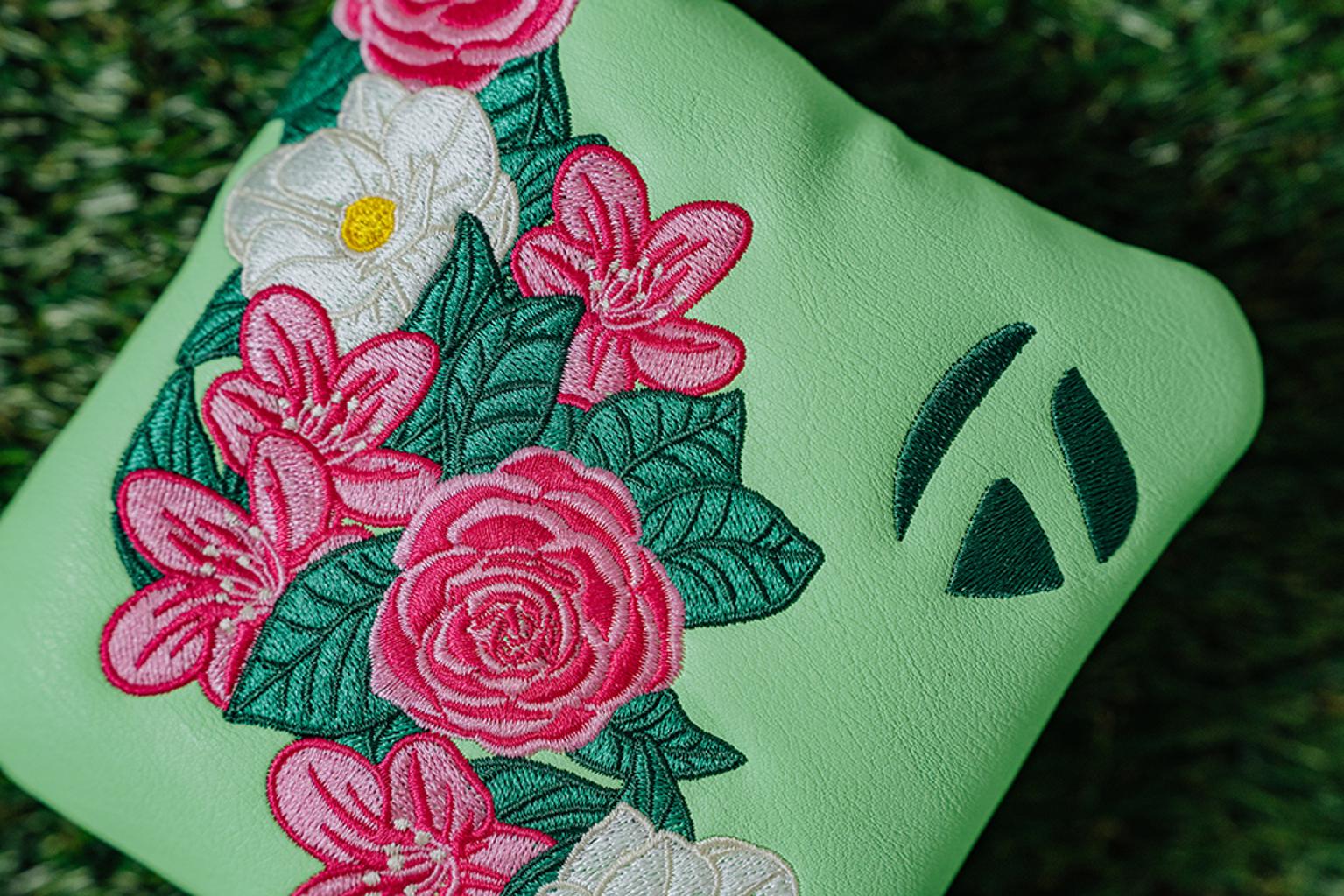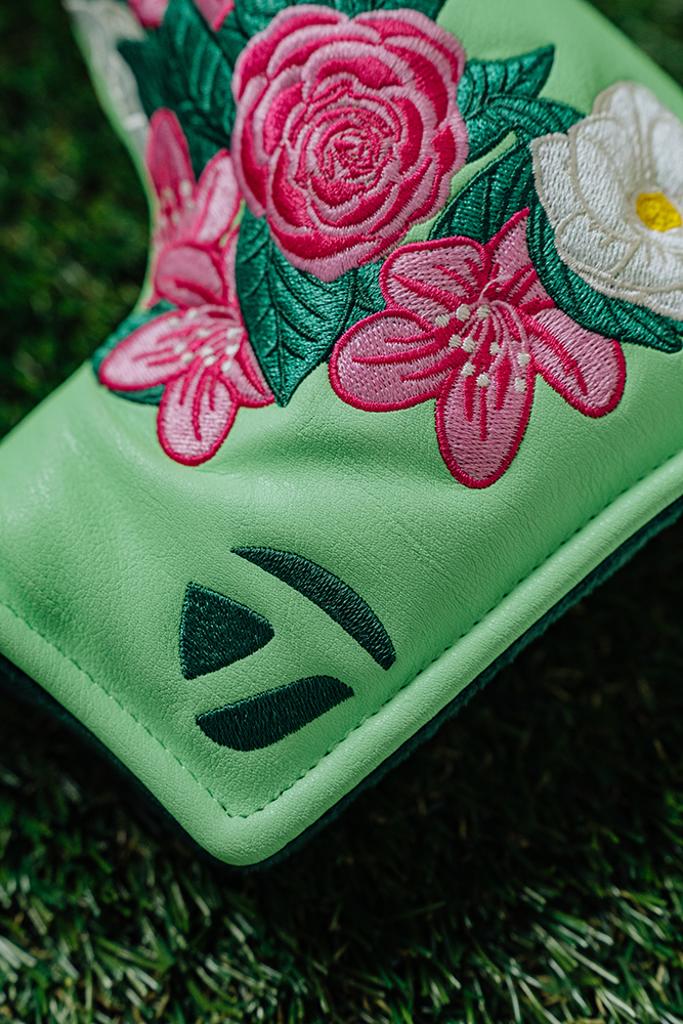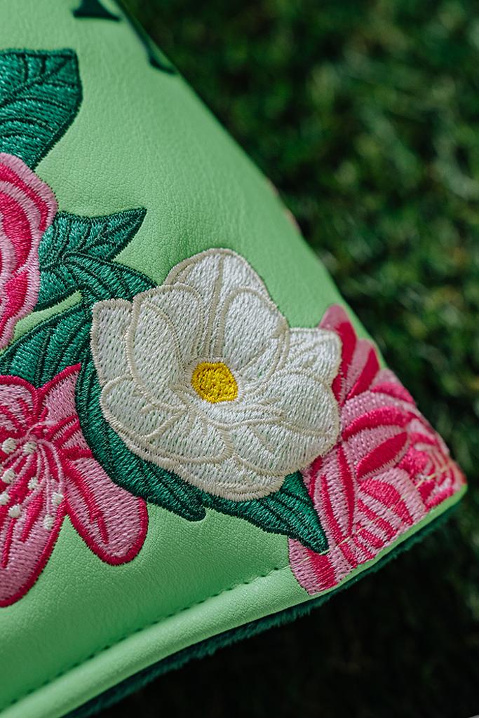 The putter headcovers are adorned with beautiful pink and white flowers, elegantly contrasted against a refreshing light green backdrop. Each headcover features a velour-lined interior in a rich dark green, ensuring your clubs remain safeguarded at all times.