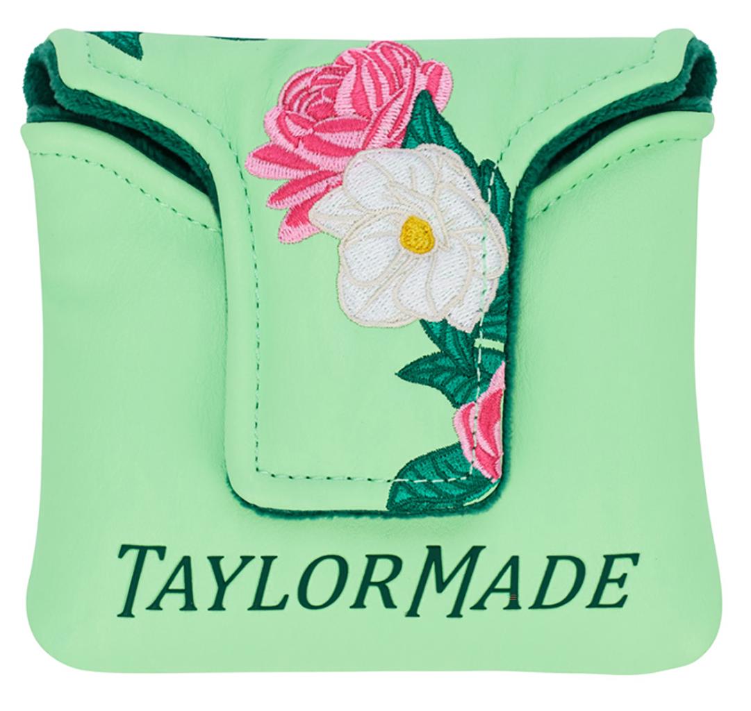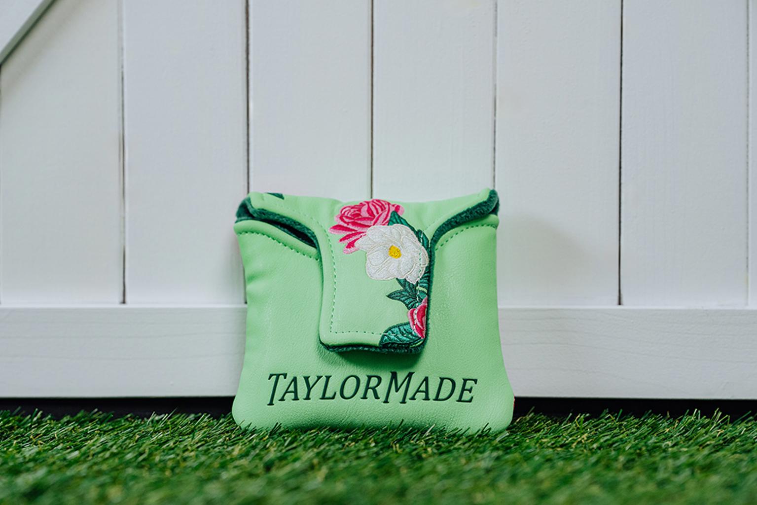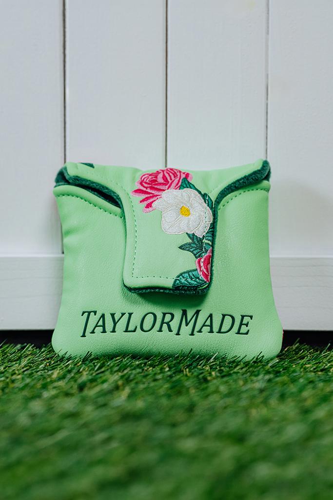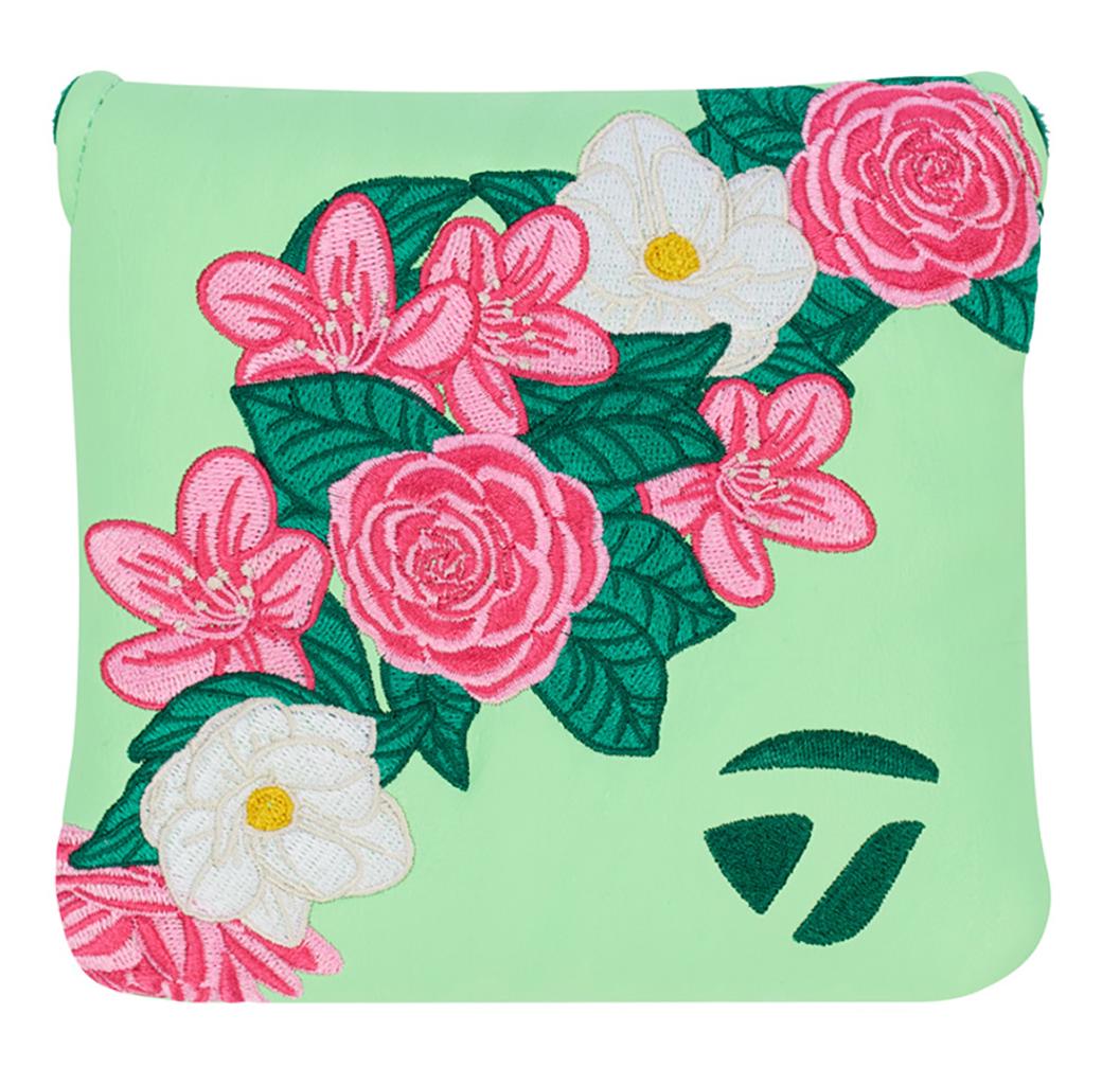The putter headcovers are adorned with beautiful pink and white flowers, elegantly contrasted against a refreshing light green backdrop. Each headcover features a velour-lined interior in a rich dark green, ensuring your clubs remain safeguarded at all times.