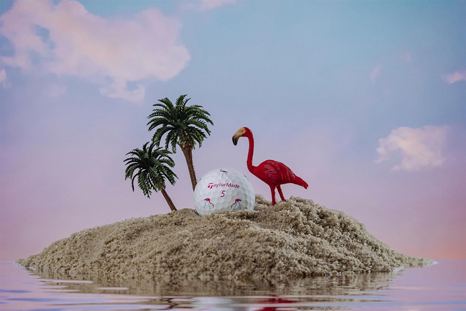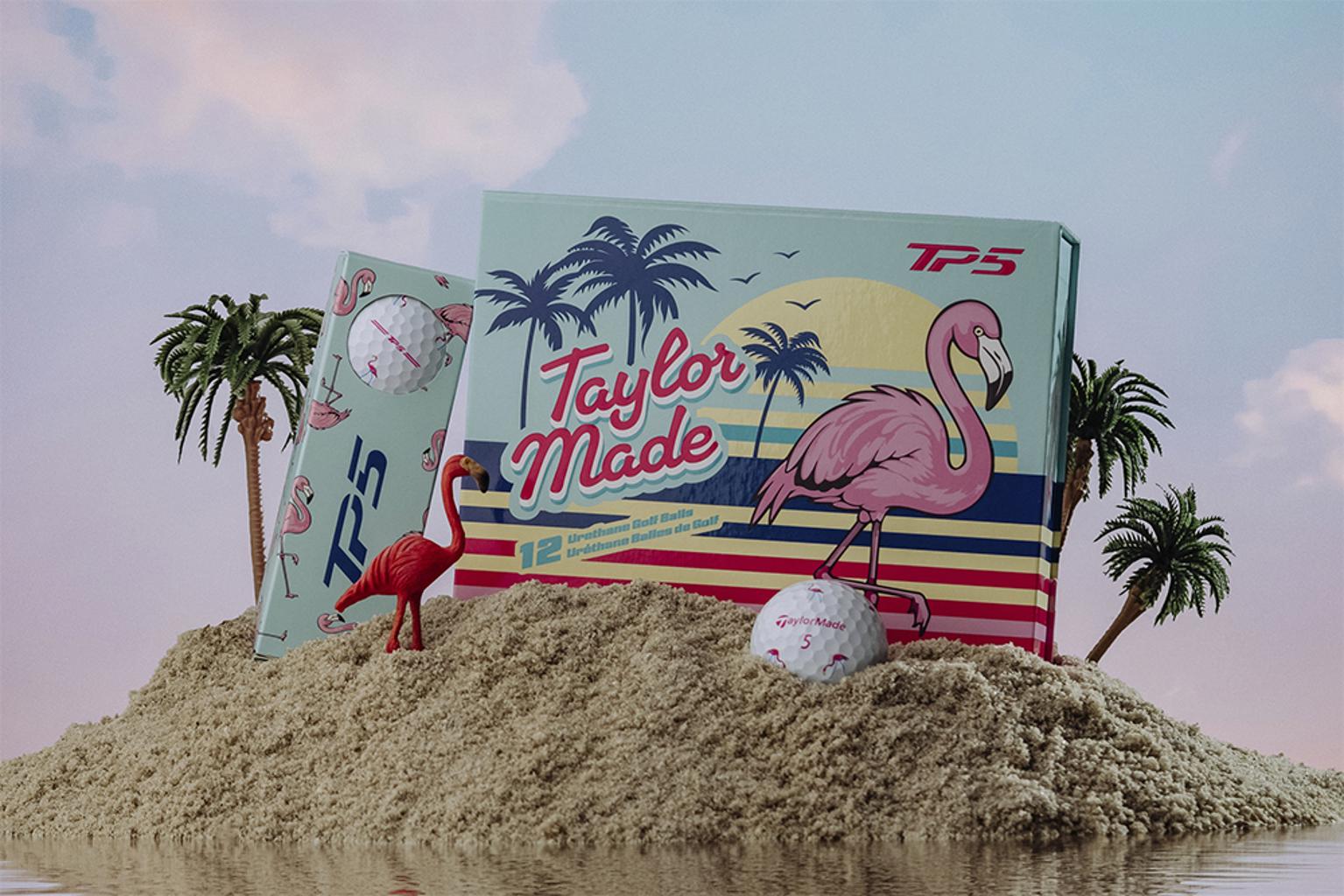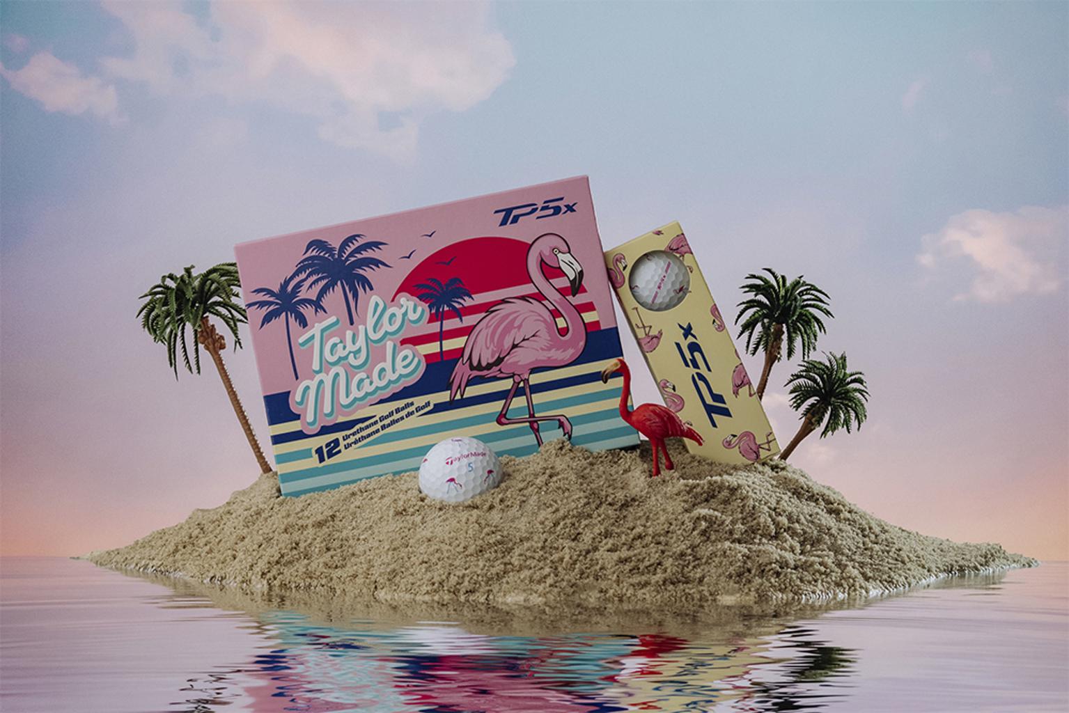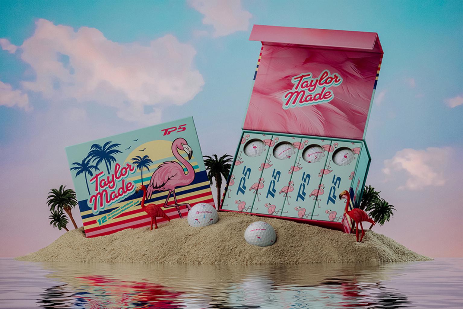Each golf ball is adorned with charming pink flamingos, adding a touch of tropical flair to every swing. The TP5 sleeves showcase a refreshing seafoam green, while the TP5x comes in a sandy hue; both featuring flamingos once more. Each dozen is beautifully packaged with a stunning tropical beach scene, depicting a flamingo standing gracefully in the water, palm trees dancing in the gentle breeze, and the sun setting over the ocean. The vibrant TaylorMade logo completes this beach-inspired look.