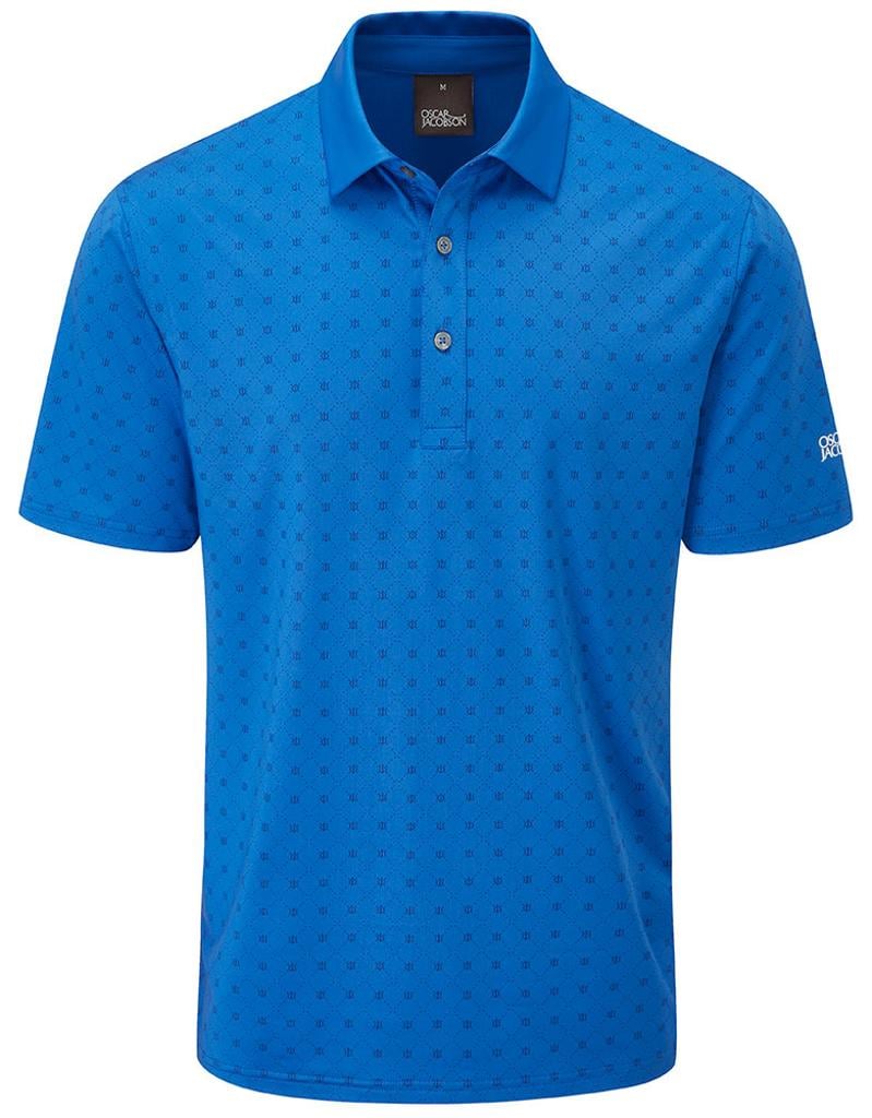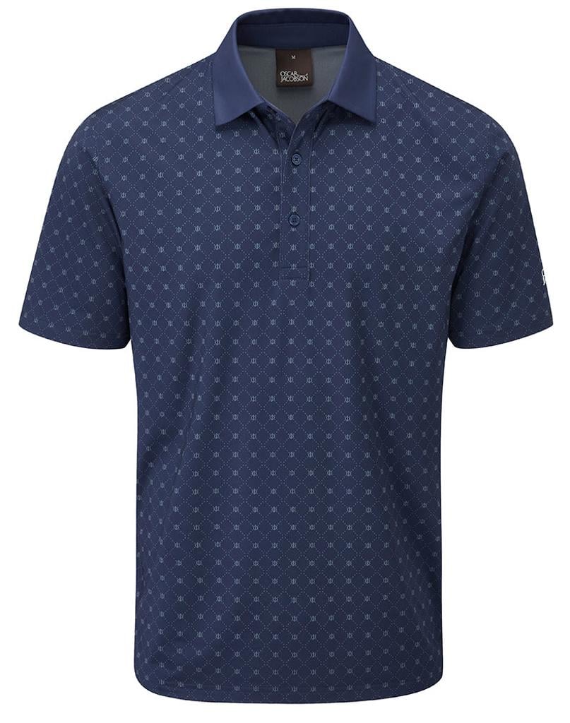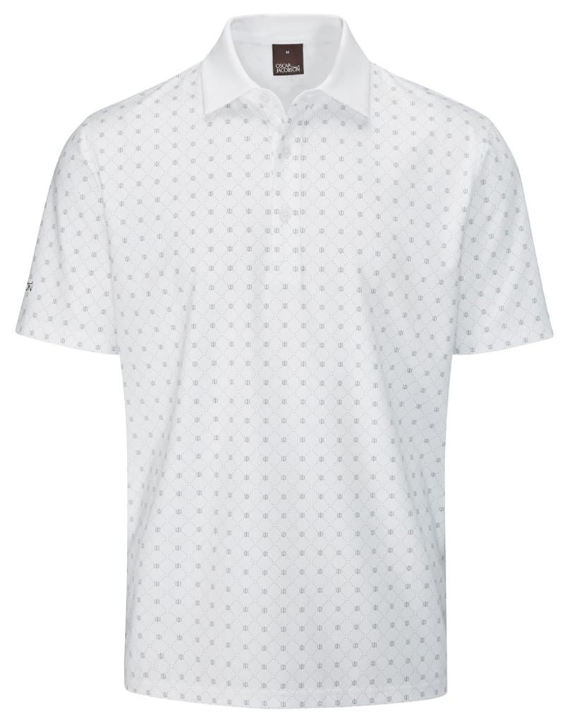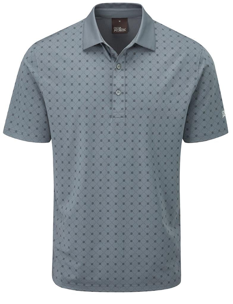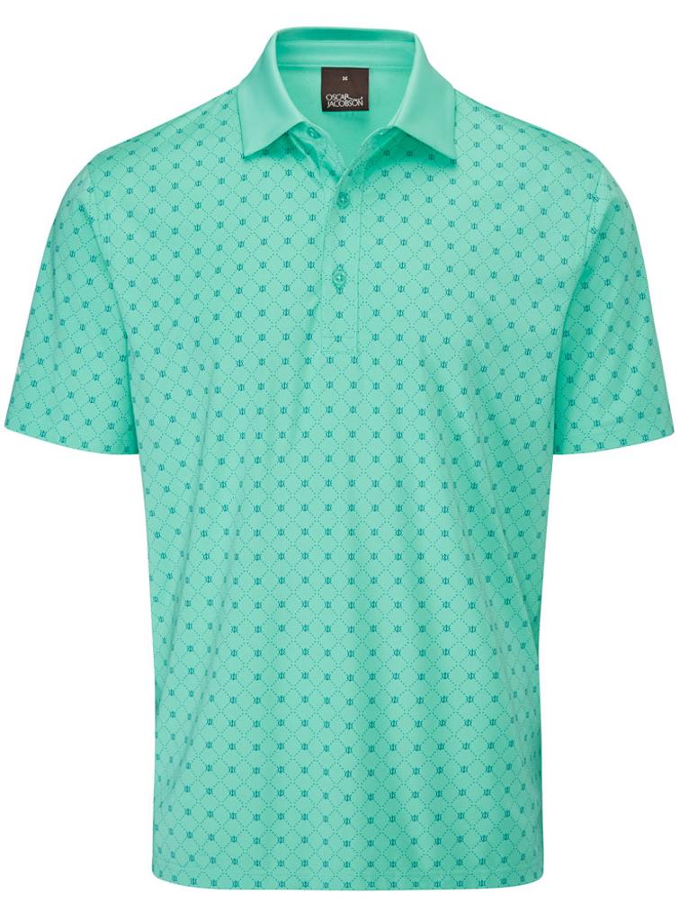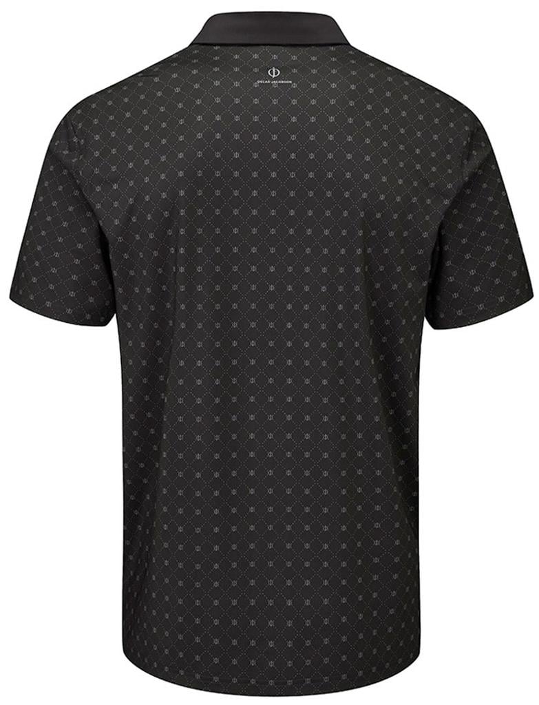 Stretch knitted performance polo shirt featuring a striking all over geo print design. Technical polyester blend fabric provides exceptional breathability, moisture management and UV protection for enhanced comfort in the heat. Oscar Jacobson logo on left sleeve and OJ logo on back neck.