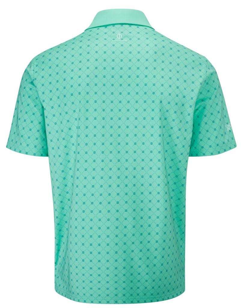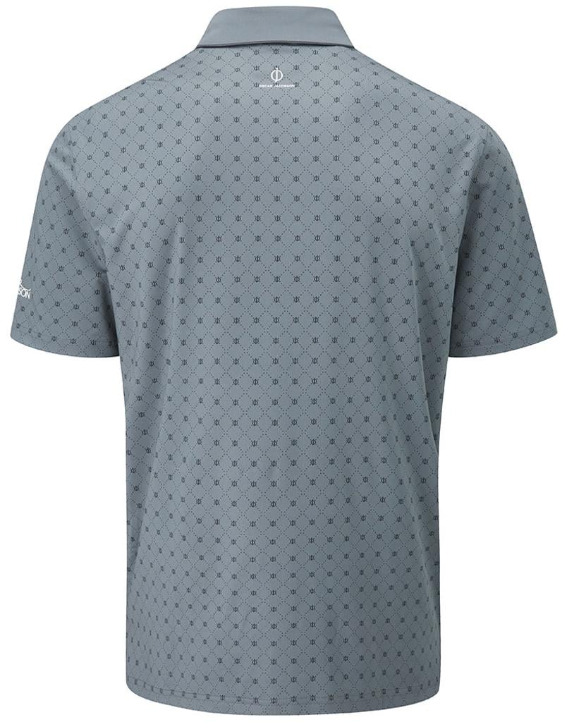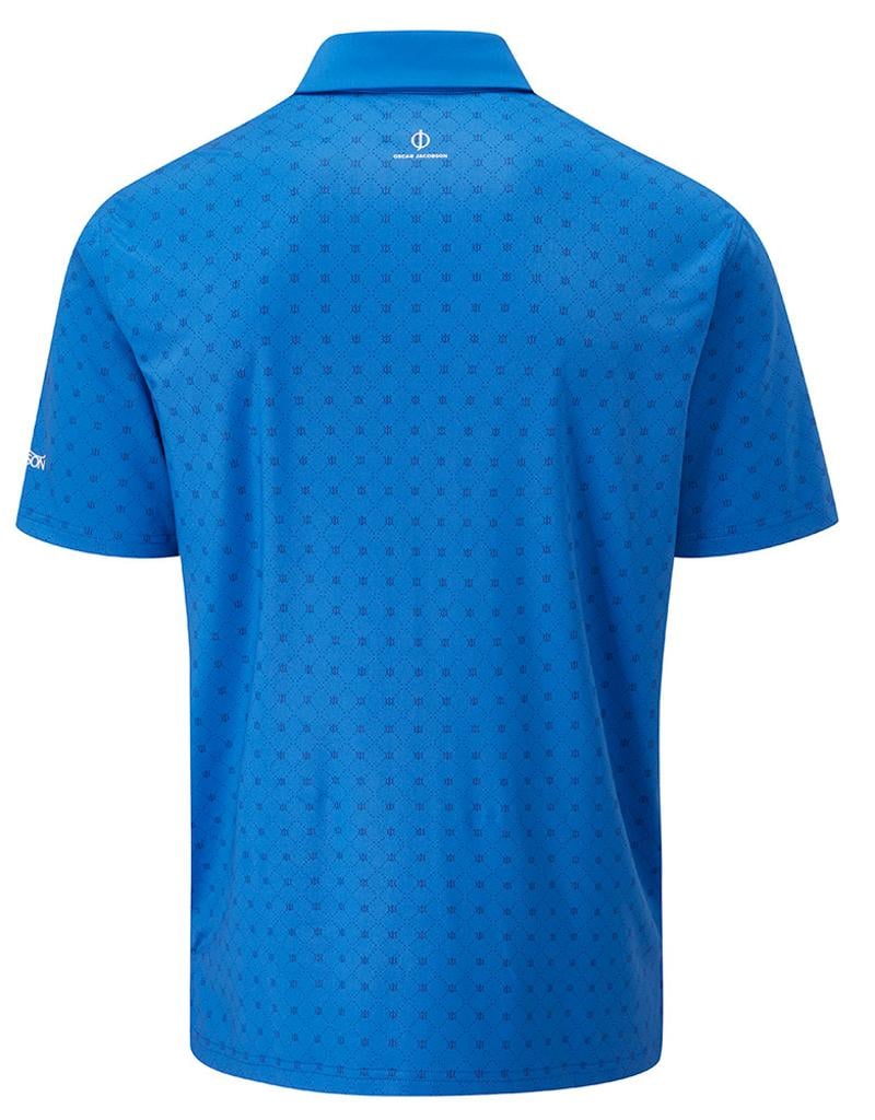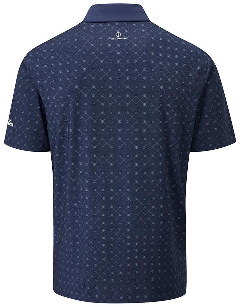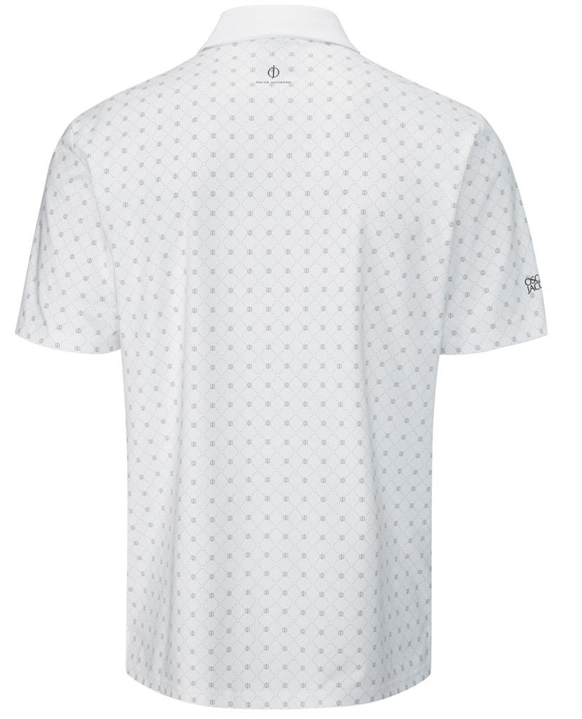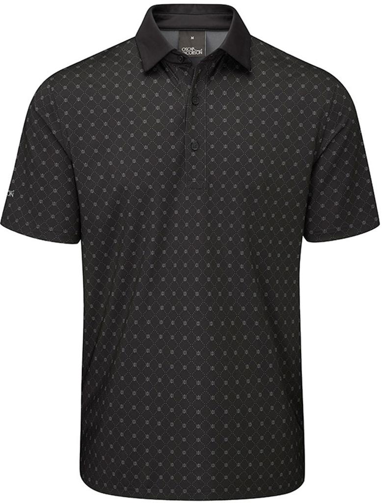 Stretch knitted performance polo shirt featuring a striking all over geo print design. Technical polyester blend fabric provides exceptional breathability, moisture management and UV protection for enhanced comfort in the heat. Oscar Jacobson logo on left sleeve and OJ logo on back neck.