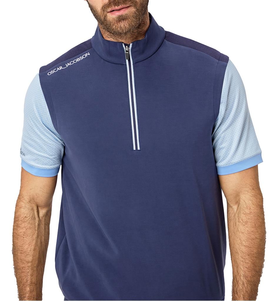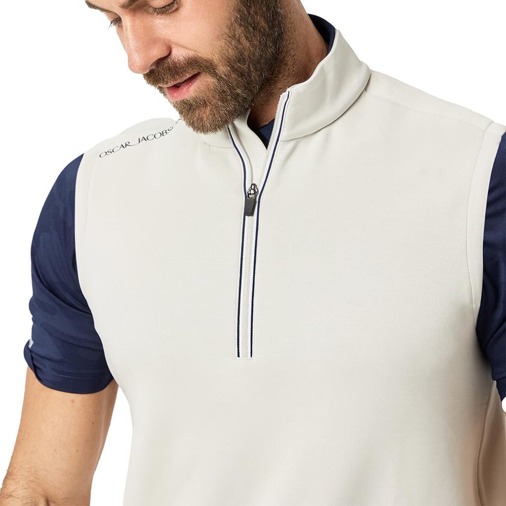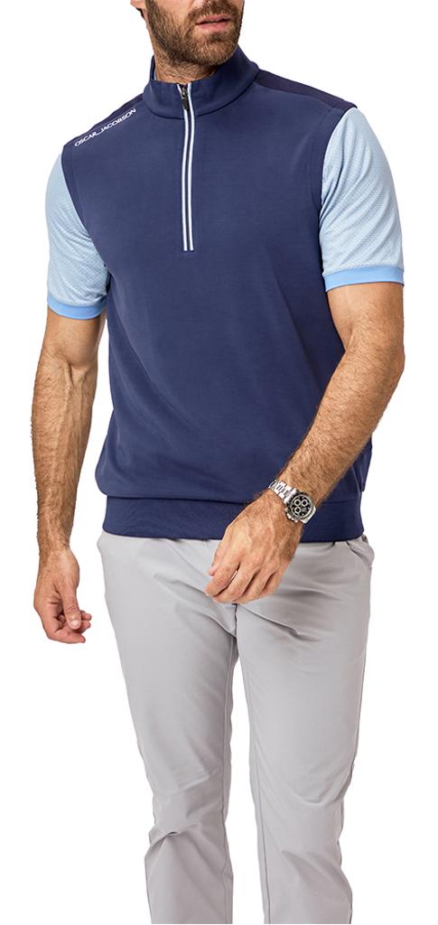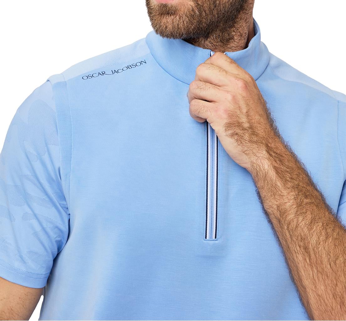 Breathable and moisture-wicking, it effectively keeps you cool and dry in warmer conditions. Accented with a striking contrast stripe zip tape and subtle tipping on the inner collar and hem, this piece seamlessly fuses performance with a modern, stylish appearance, making it suitable for both on-course activities and active layering.