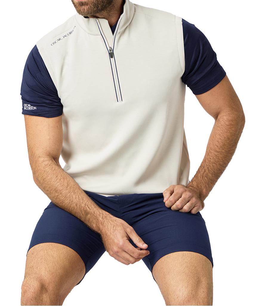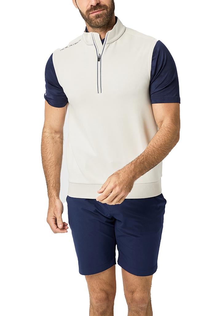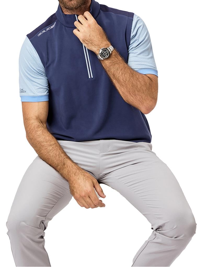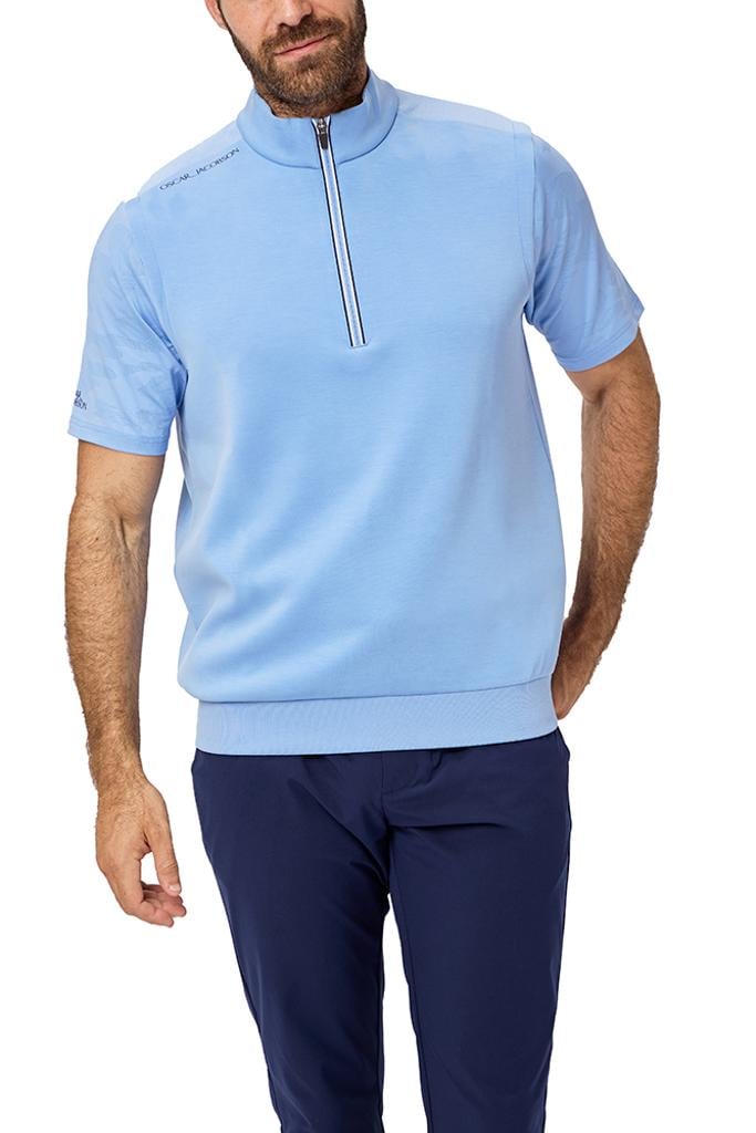 Breathable and moisture-wicking, it effectively keeps you cool and dry in warmer conditions. Accented with a striking contrast stripe zip tape and subtle tipping on the inner collar and hem, this piece seamlessly fuses performance with a modern, stylish appearance, making it suitable for both on-course activities and active layering.