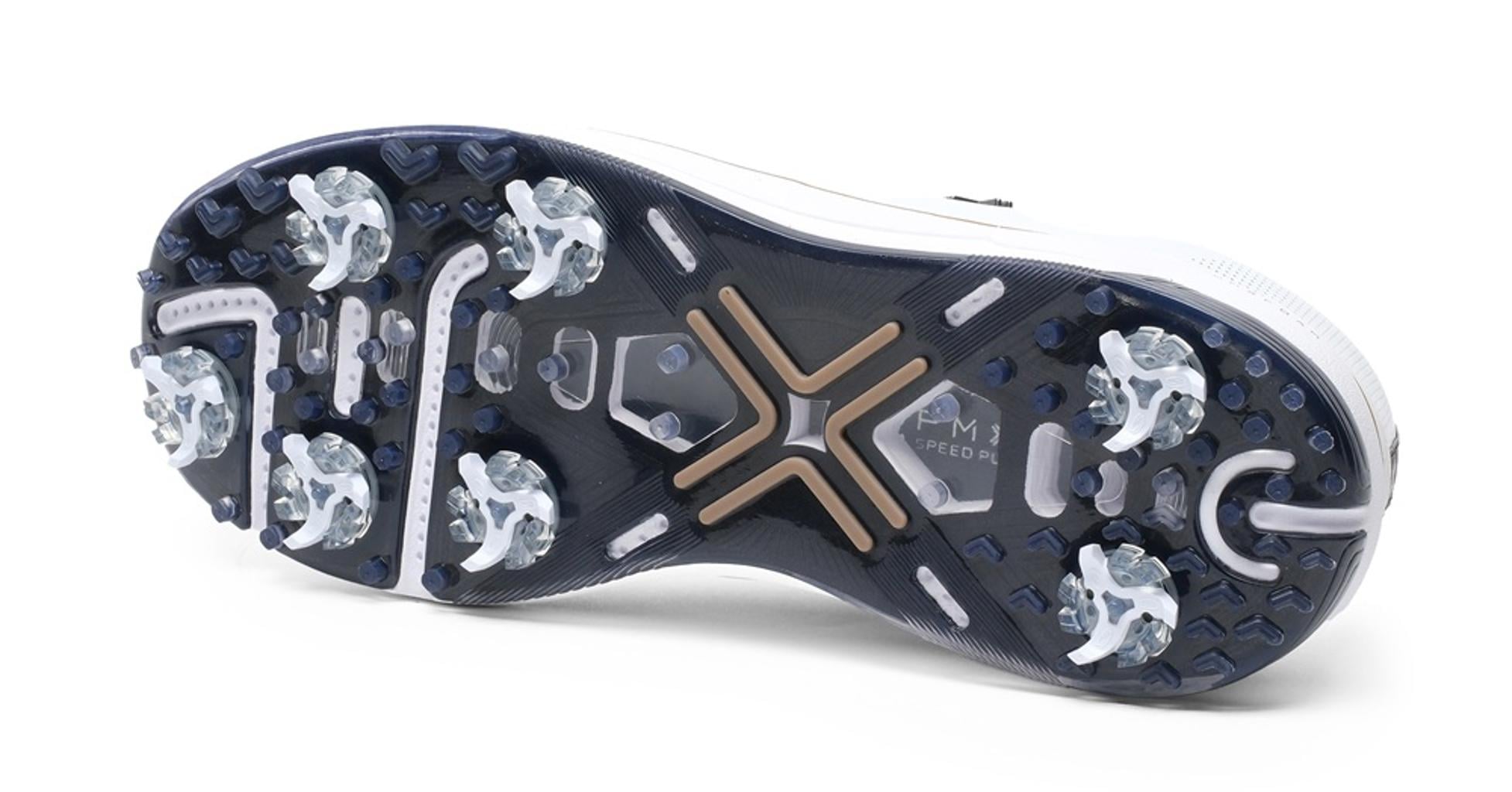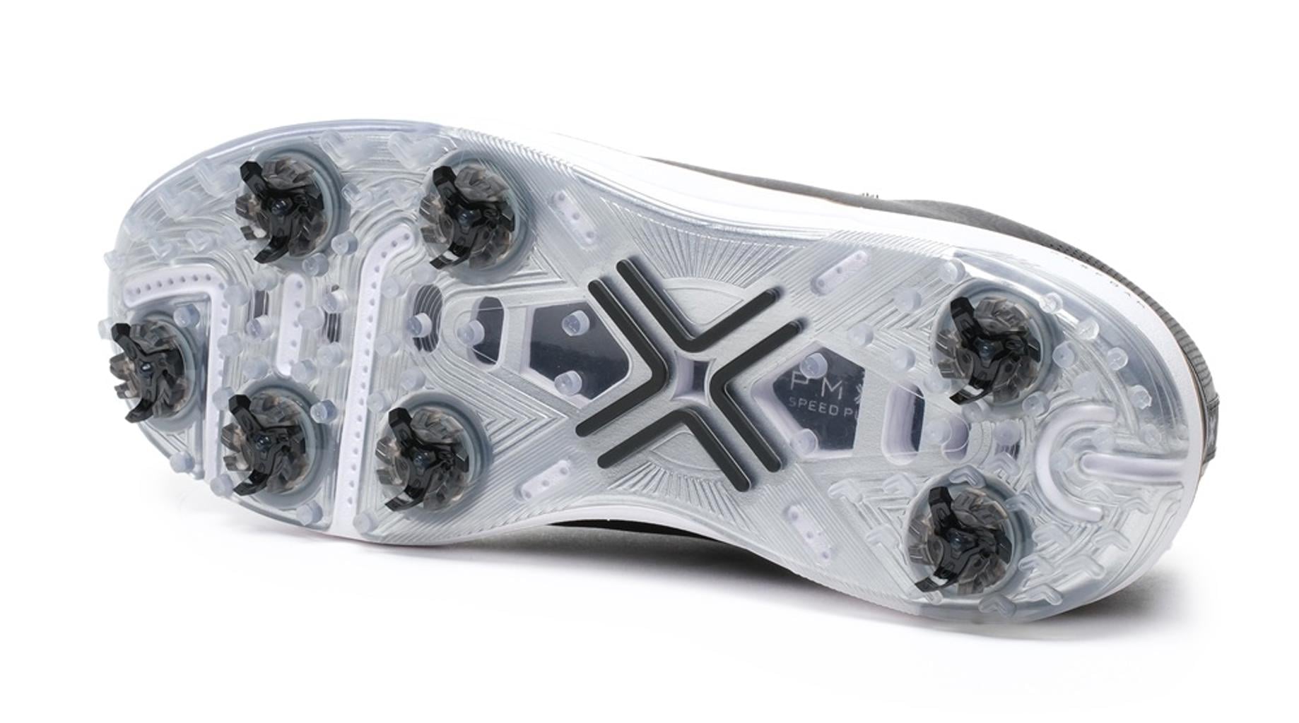 The PMXSPEED Plate propulsion plate allows golfers to harness ground reaction forces more effectively. The TPU outsole, equipped with a Fast Twist insert system, ensures multidimensional traction throughout the shoe's lifespan.