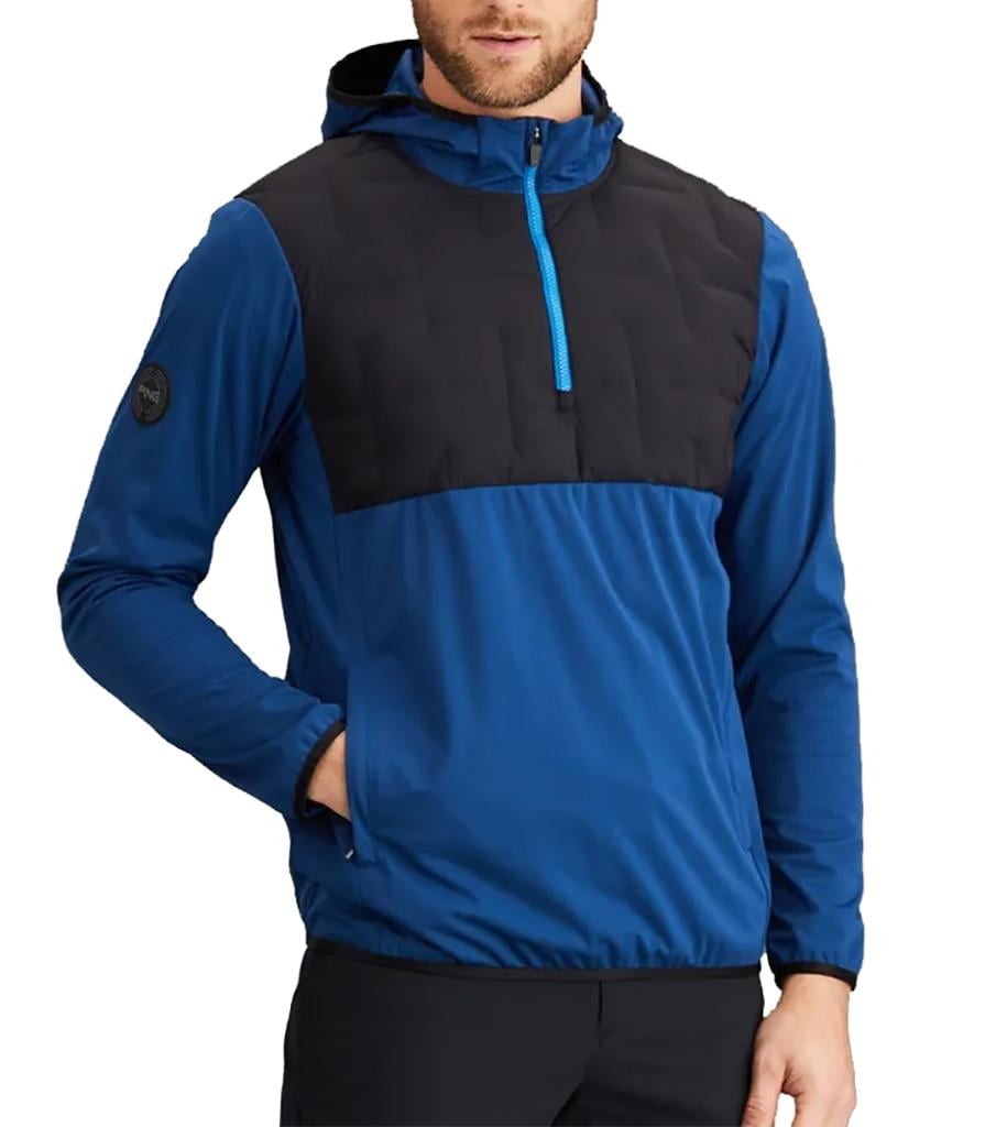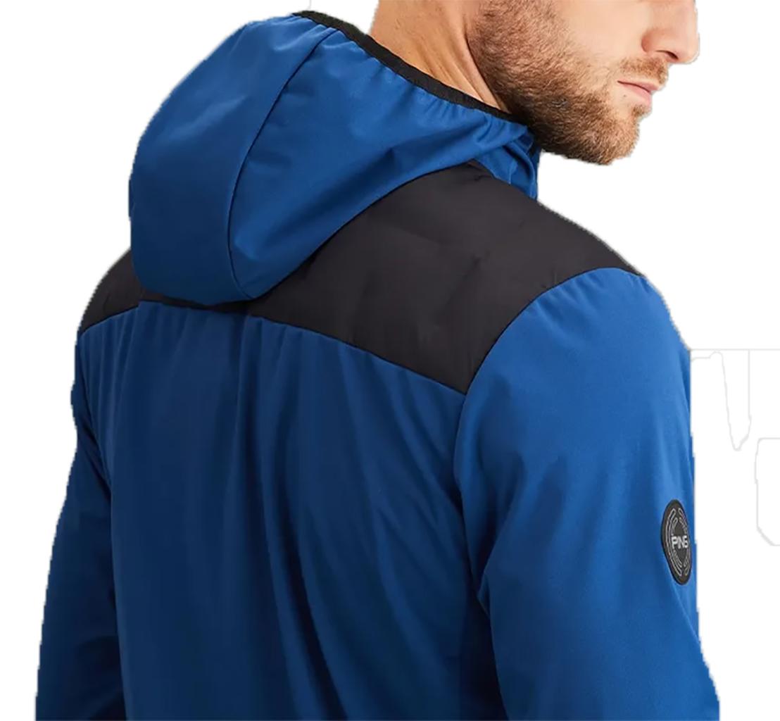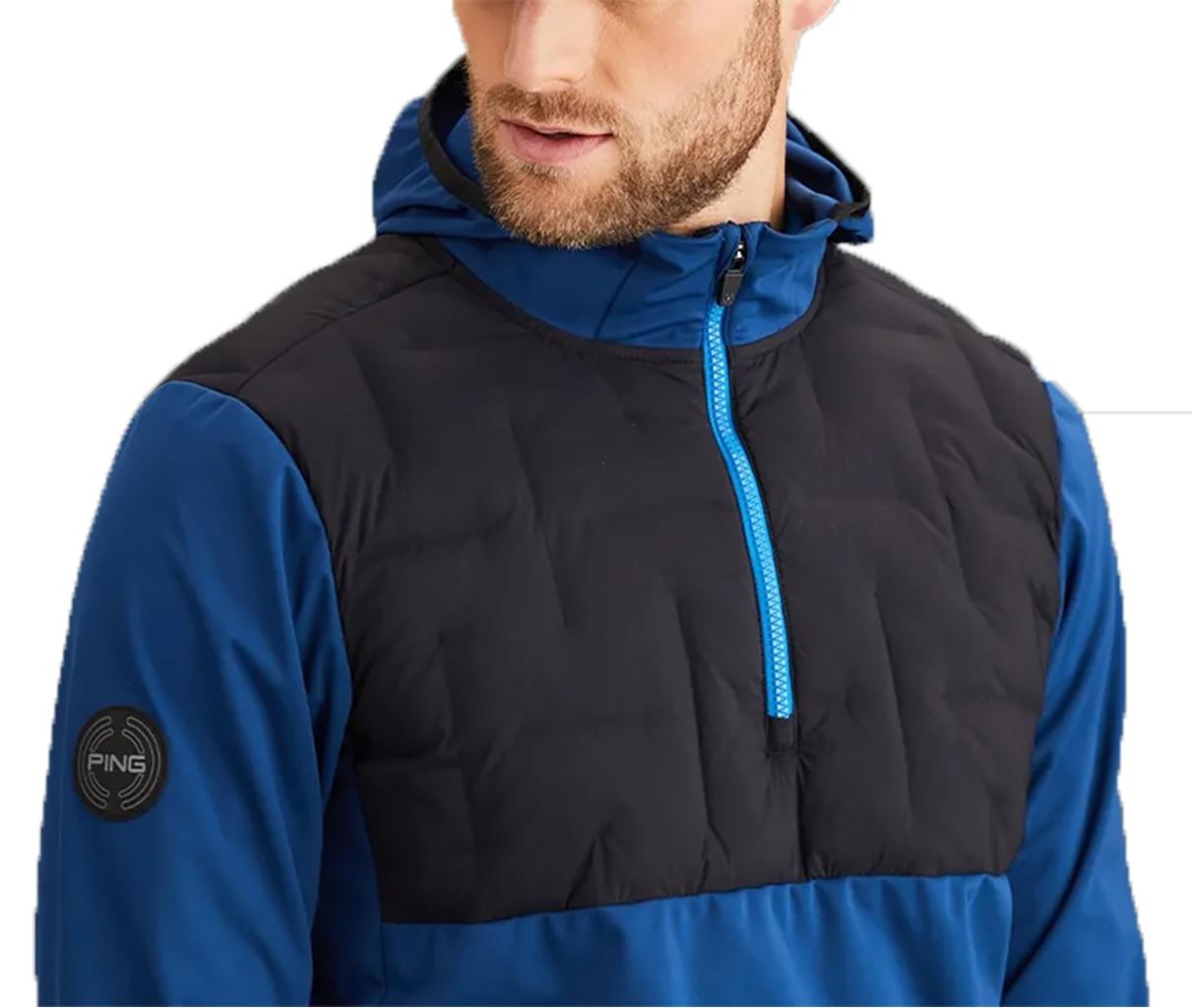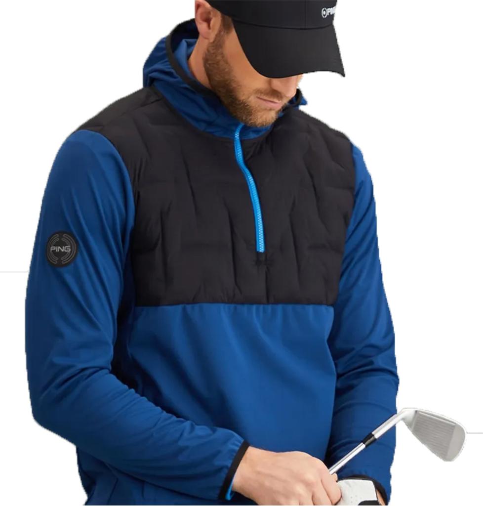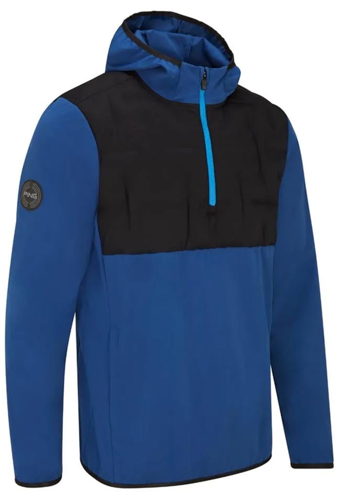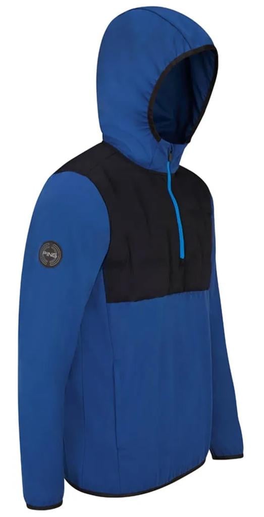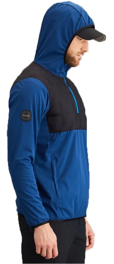 The hooded design of the jacket significantly boosts weather resistance, while the stretch binding at the hem, cuffs, and hood guarantees a secure and comfortable fit. For added functionality, it includes two front pockets lined with brushed fabric to keep your hands warm, and the PING Eye rubber badge on the sleeve adds a touch of style.