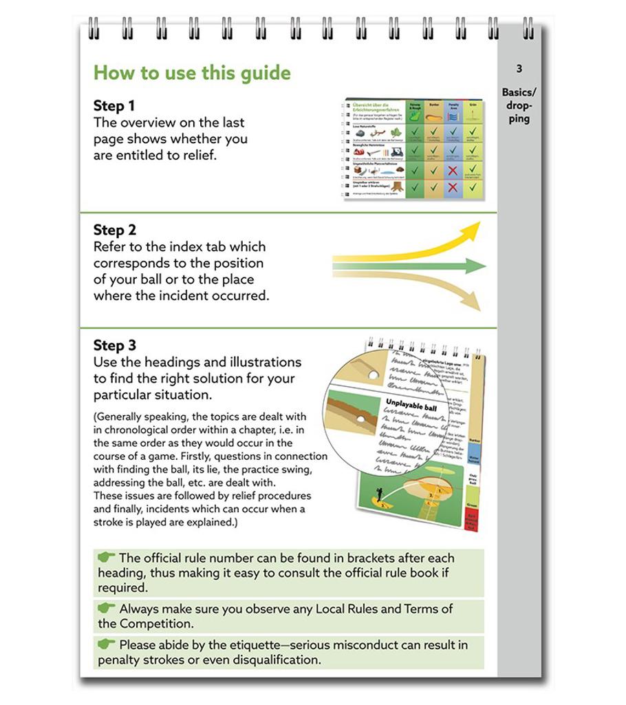 - The book is divided into sections by means of index tabs that correspond to an actual round of golf: “Tee”, “Fairway & rough”, “Bunker”, “Penalty area” etc