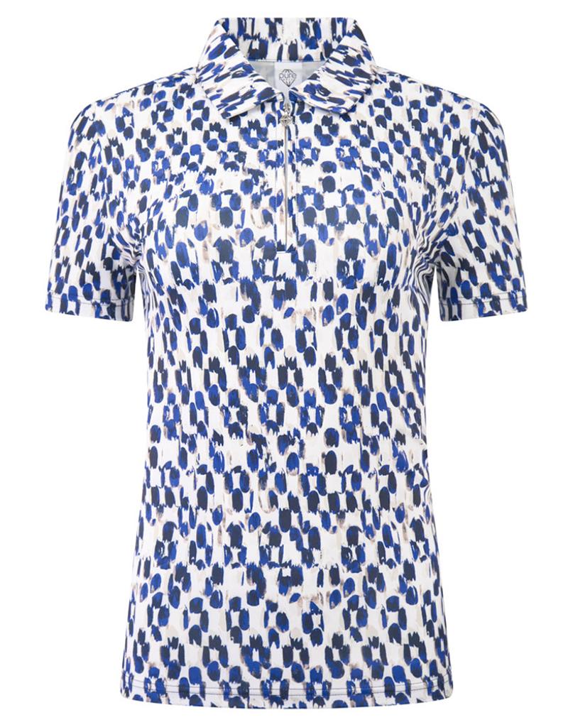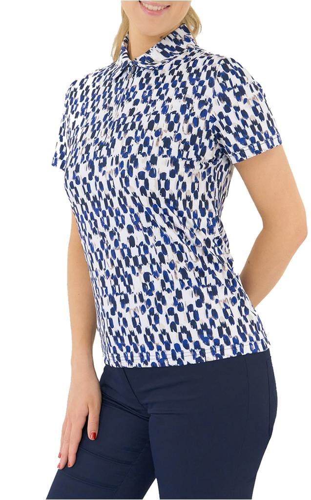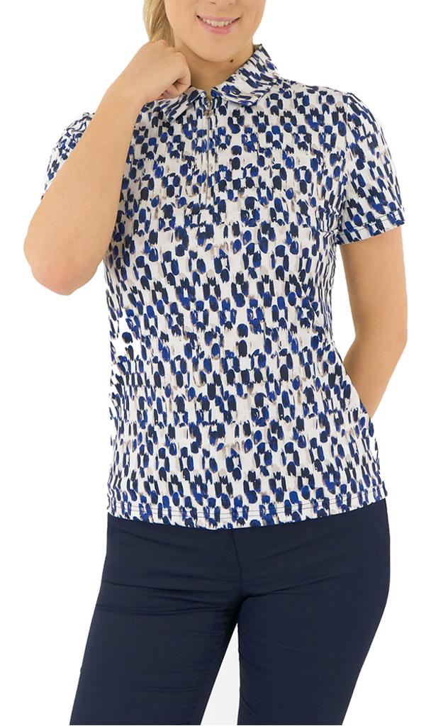 A modern, abstract spot print in navy and sand tones creates a chic, textural appearance inspired by the dynamic beauty of coastal dunes.