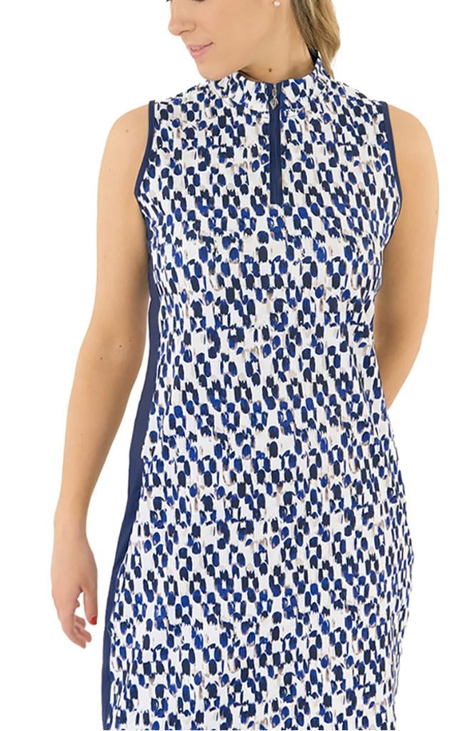 A modern, abstract spot print in navy and sand tones creates a chic, textural look inspired by shifting coastal dunes.