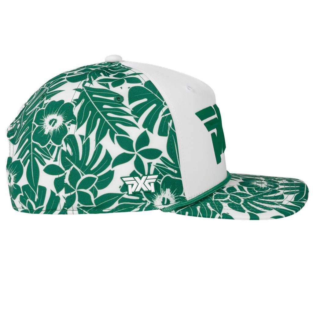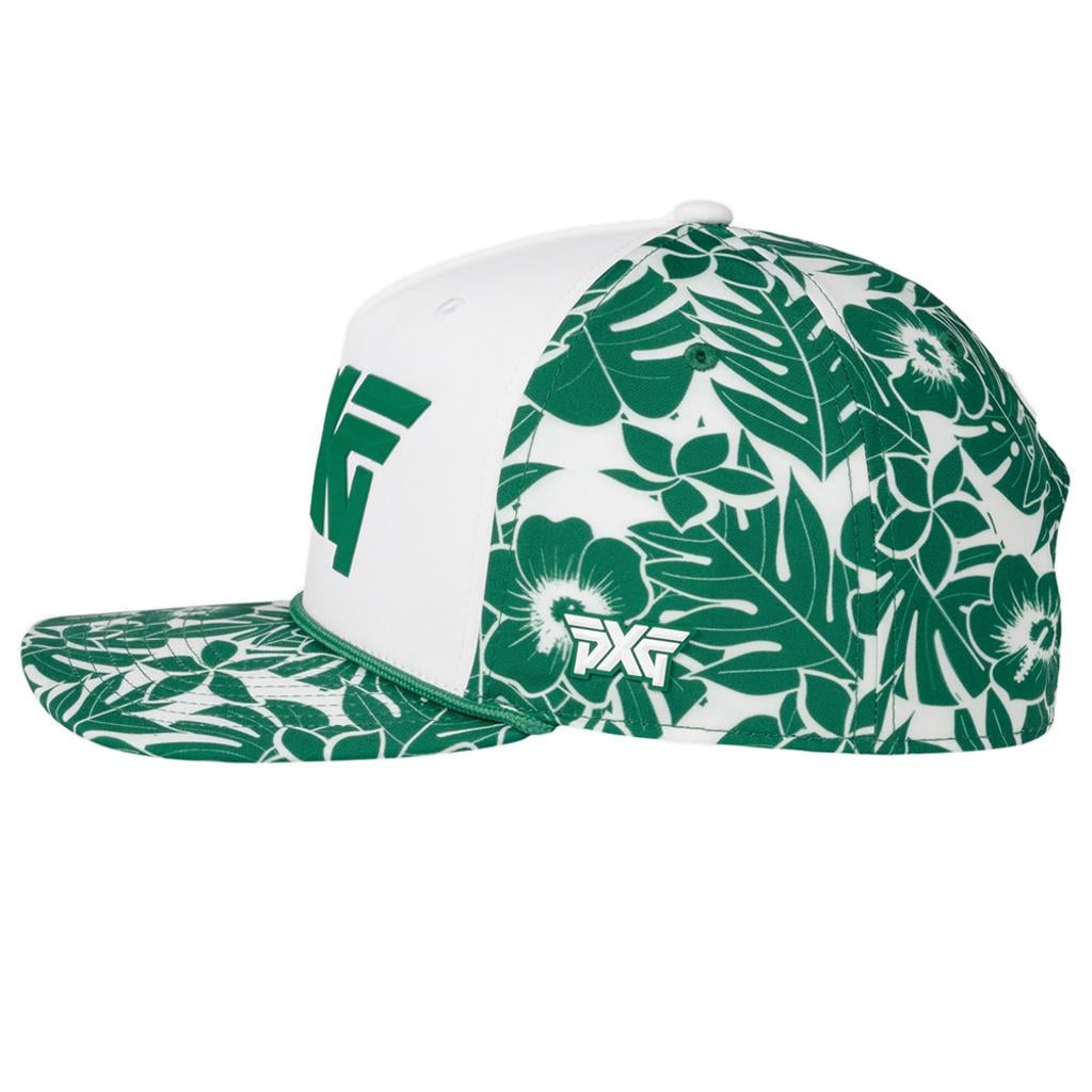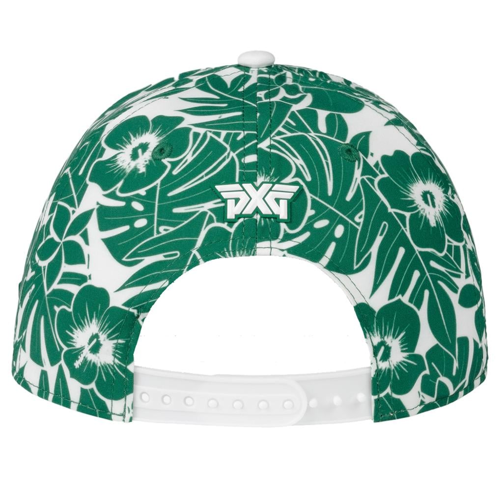 Add a touch of tropical flair to your game with the PXG Aloha 5-Panel Curved Bill Cap 2026. This cap features a vibrant, hand-drawn Aloha print showcasing native Hawaiian leaves and flowers, combining eye-catching style with day-to-day comfort.