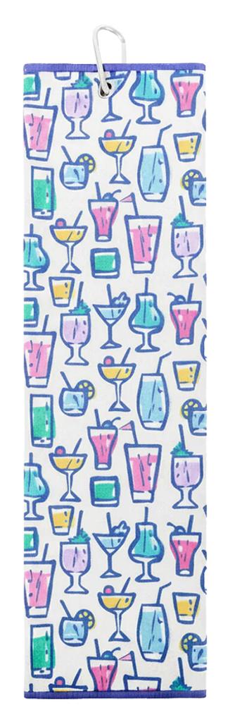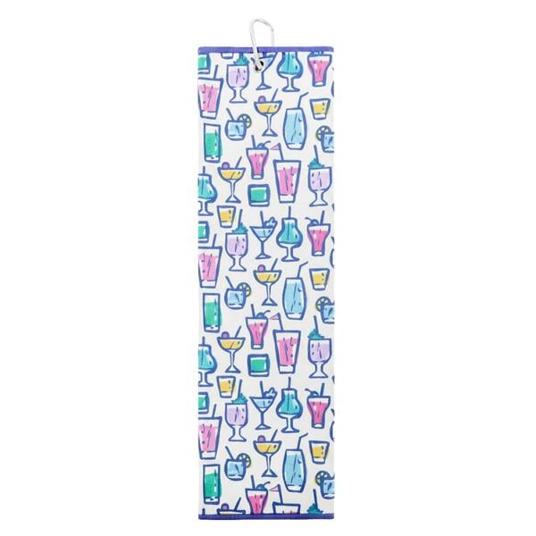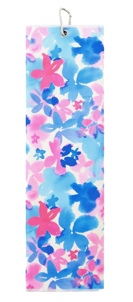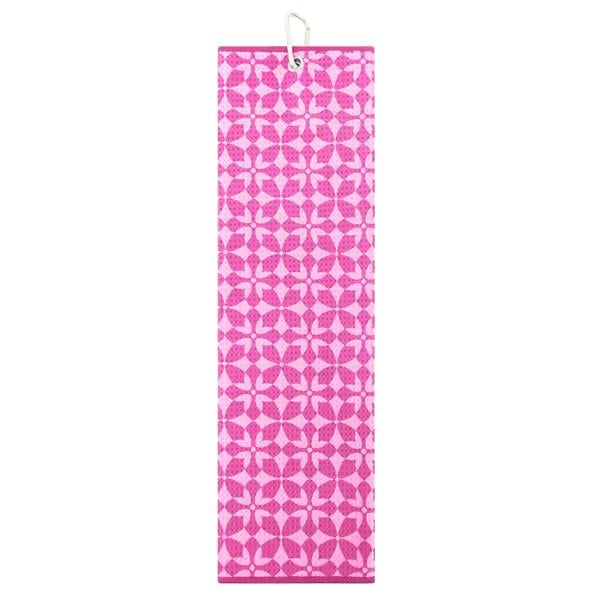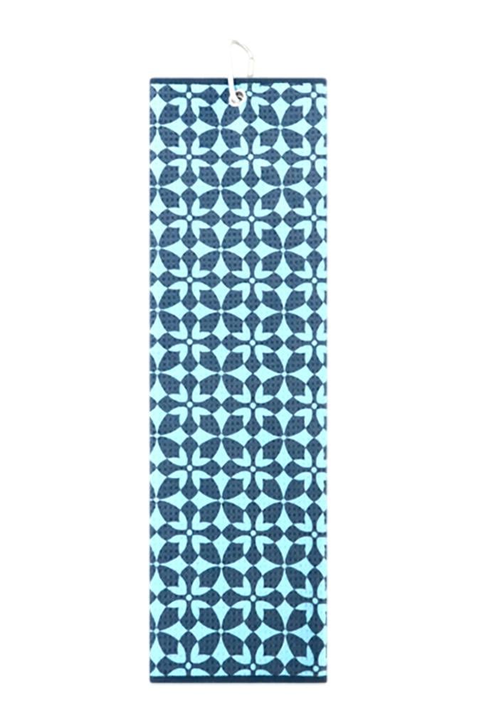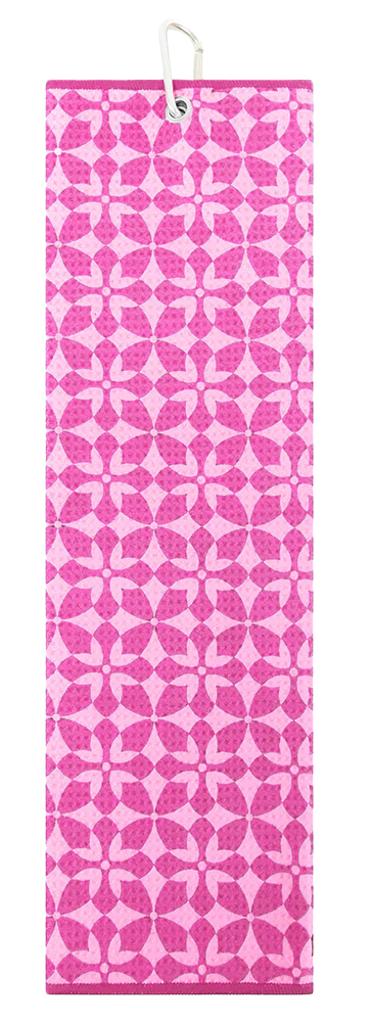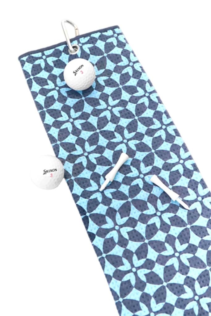 Designed with a captivating geometric pattern featuring interlocking floral shapes, this towel stands out beautifully on the golf course. The vibrant contrast of two coordinated colours brings an added layer of depth and dimension, while the practical metal ring with a carabiner clip ensures effortless attachment to your golf bag.