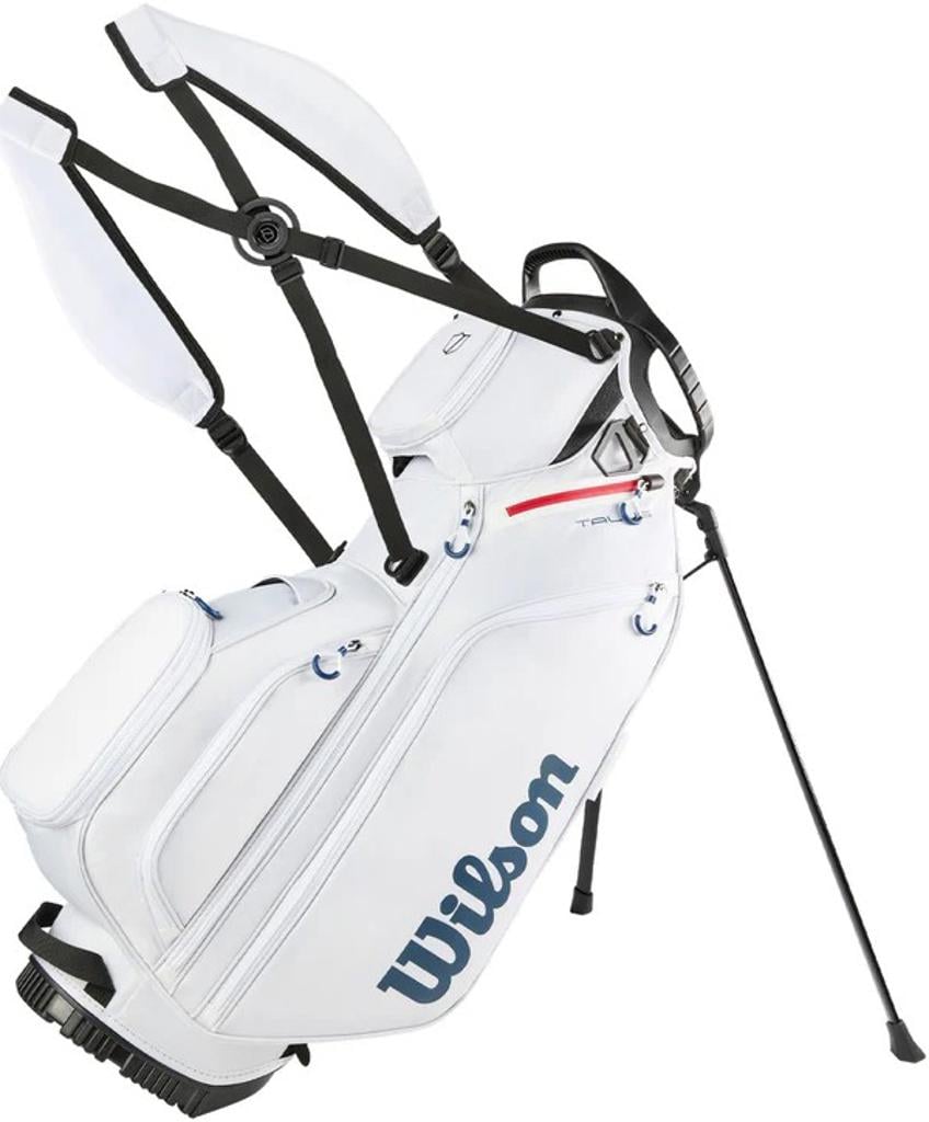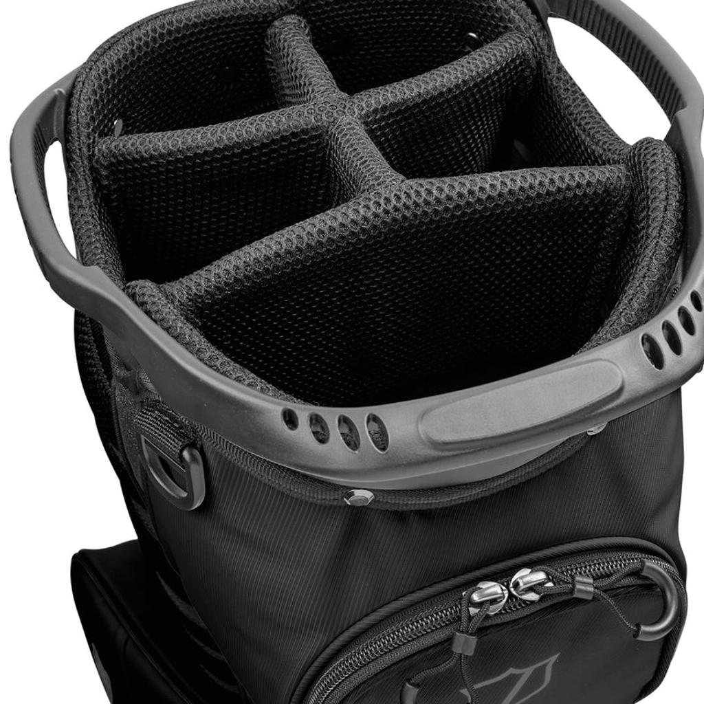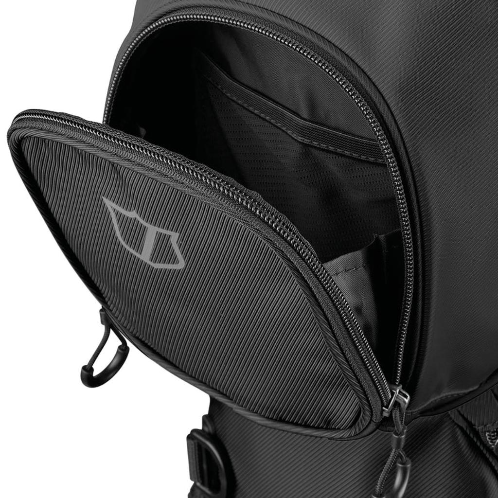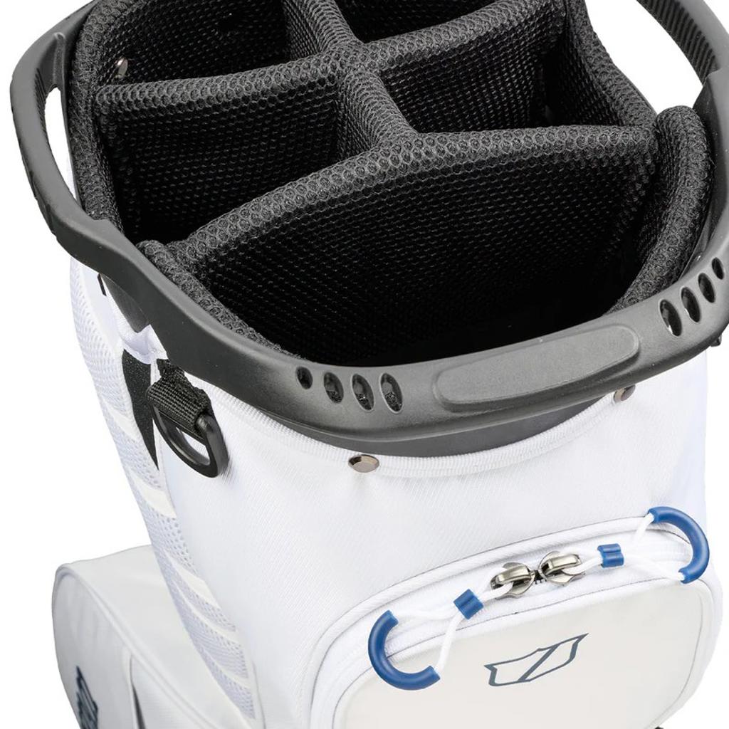 The ergonomic shoulder strap system caters to those who prefer walking the course, while a construction reinforcement system maintains the bag's structure when placed on a cart, push cart, or the ground.